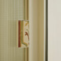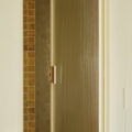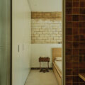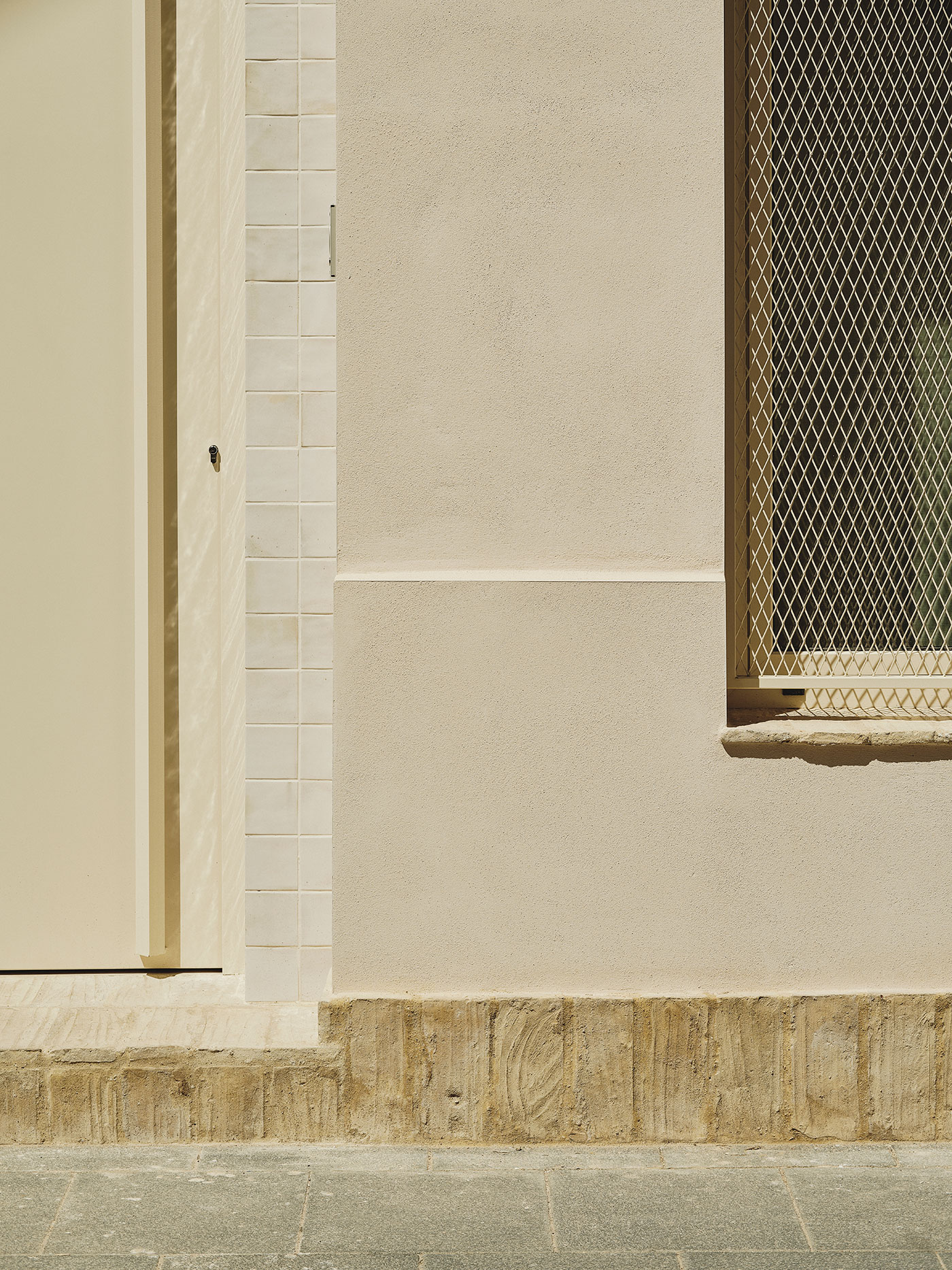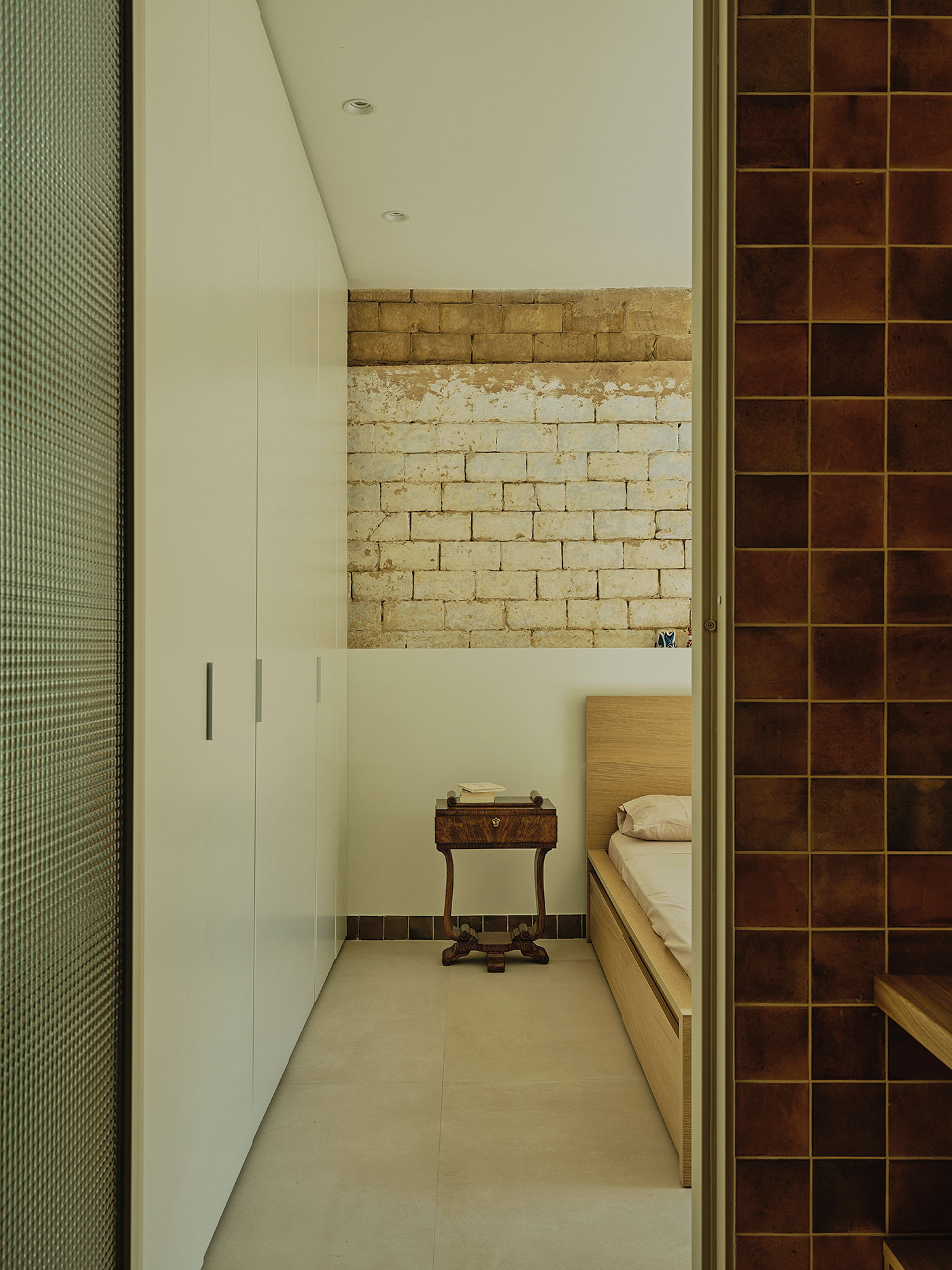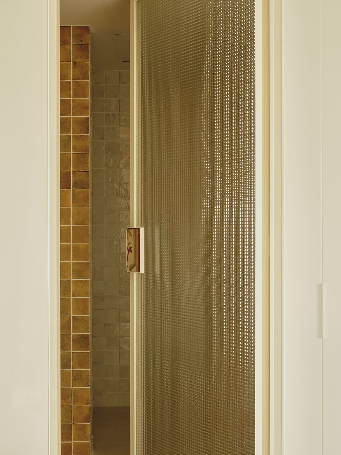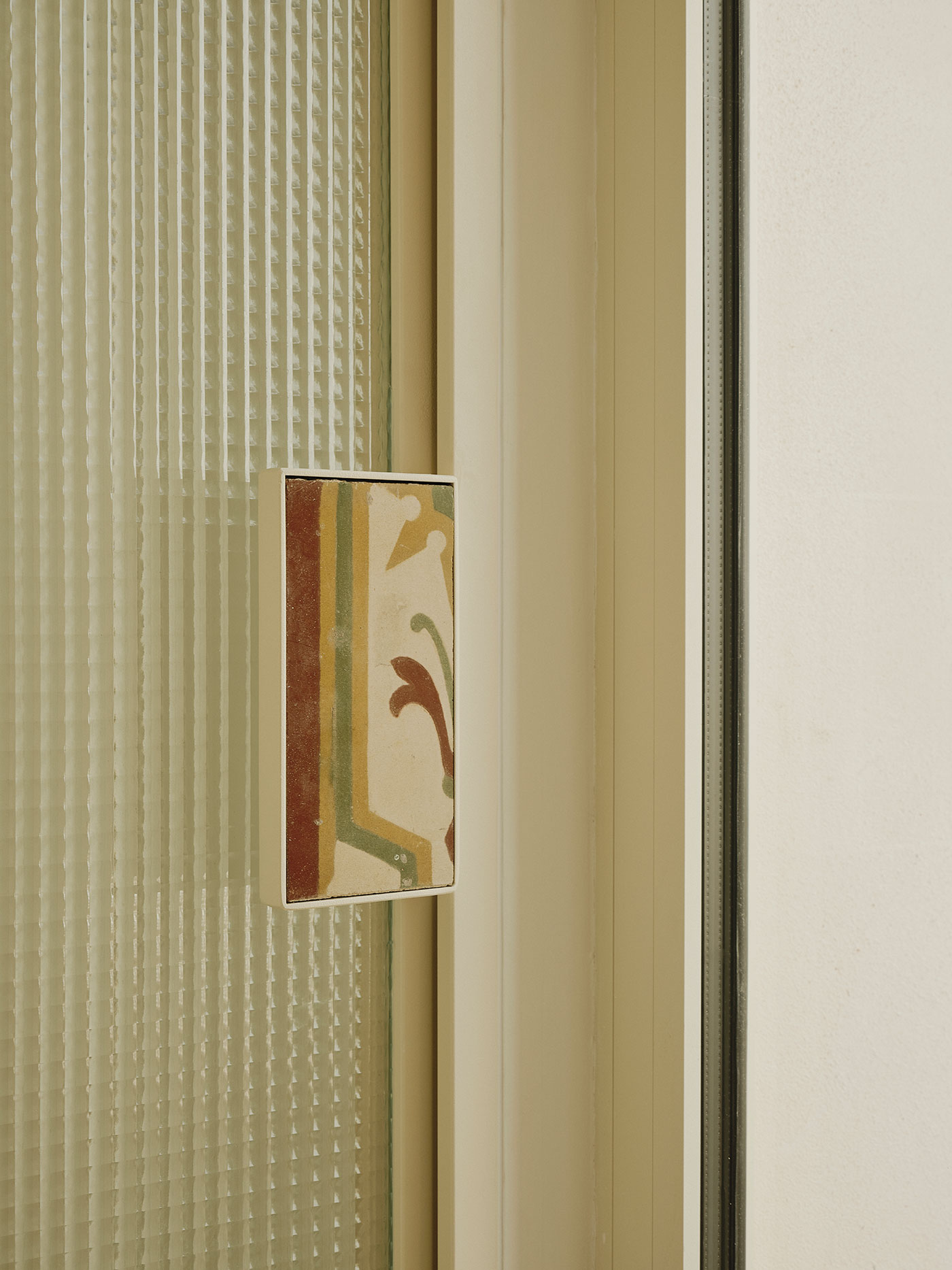 Este barro cocido dialoga con los azulejos cerámicos esmaltados de baños, cocina, piscina y todapié. Son piezas diversas, heterogéneas que aportan riqueza material y sensorial a cada espacio. El color amarillo se reserva para las zonas húmedas (baño y piscina), donde se funde con el agua para generar una tonalidad verdosa que evoca a las balsas de riego de la huerta. El esmaltado verde, en cambio, se usa para los rodapiés, dignificando este elemento y conectándolo con la memoria del zócalo original, también del mismo color.