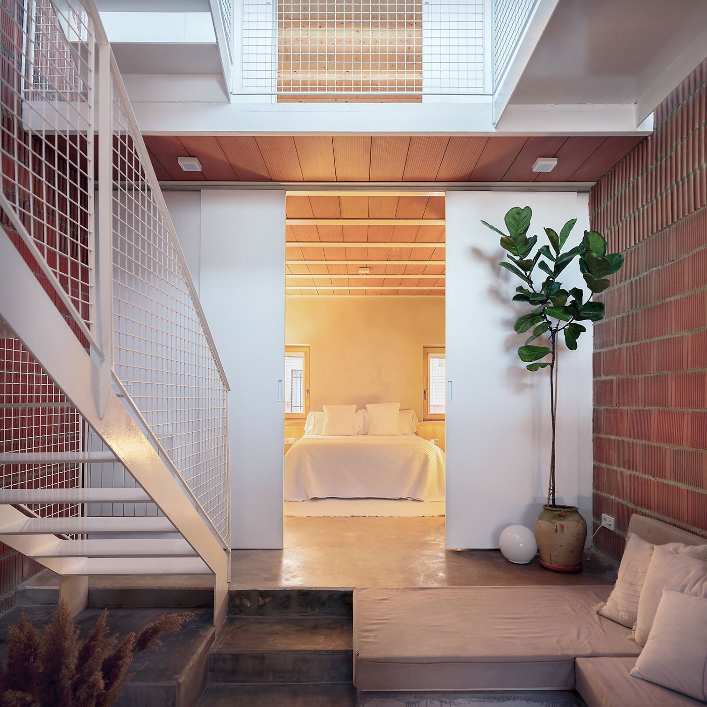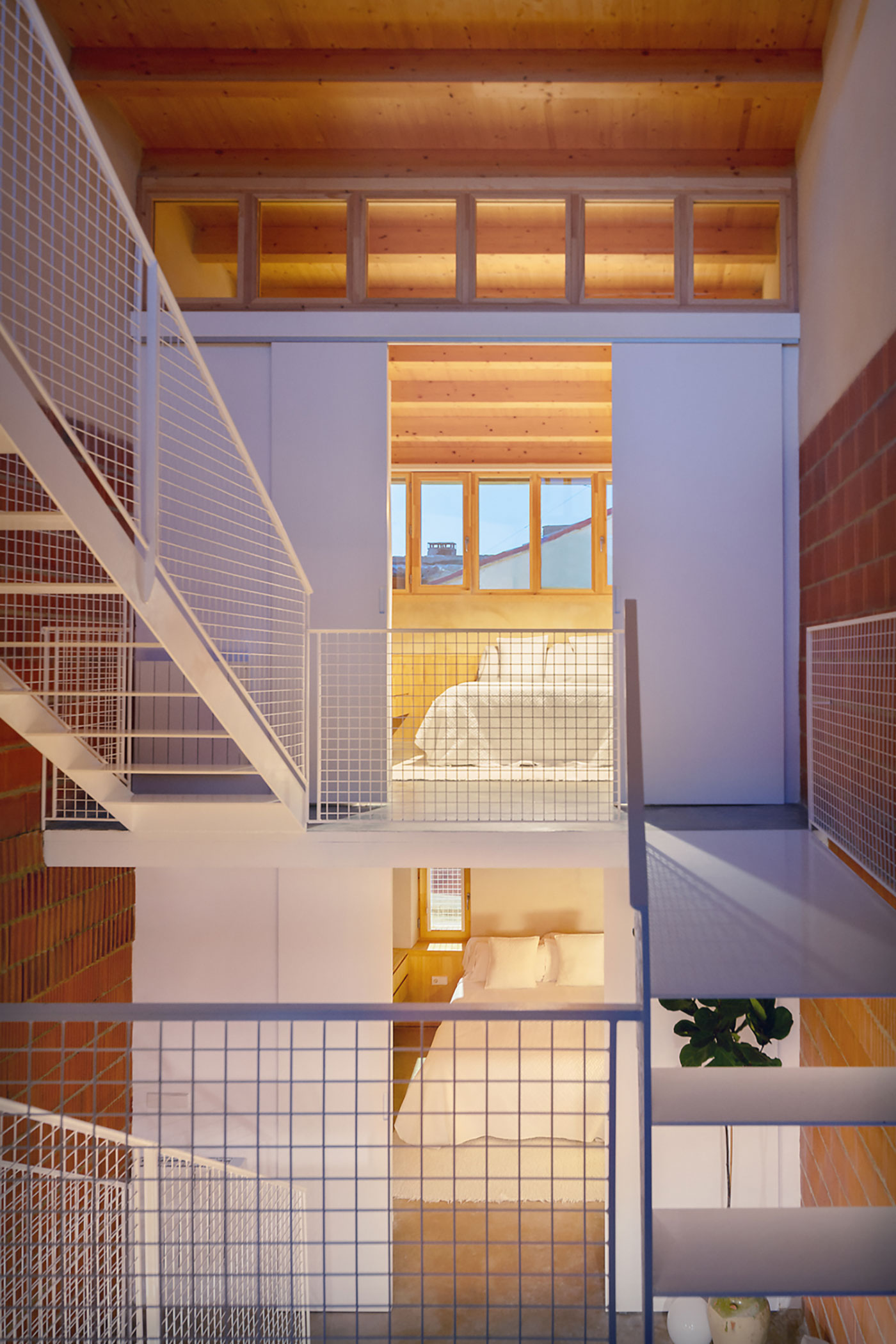 El recorrido de la vivienda comienza desde la calle de abajo donde, a través de un nuevo patio, se accede al interior. El plano del suelo, como una topografía, va generando situaciones de uso y estancia hasta llegar al vacío central donde se ubican las pasarelas que conectan las plataformas.