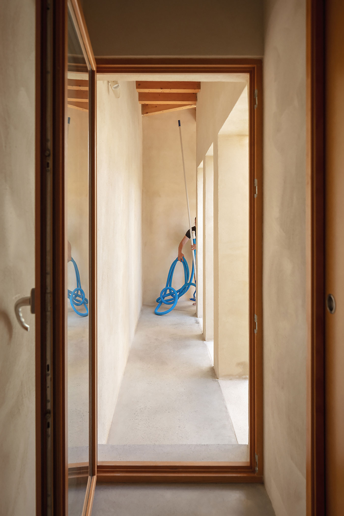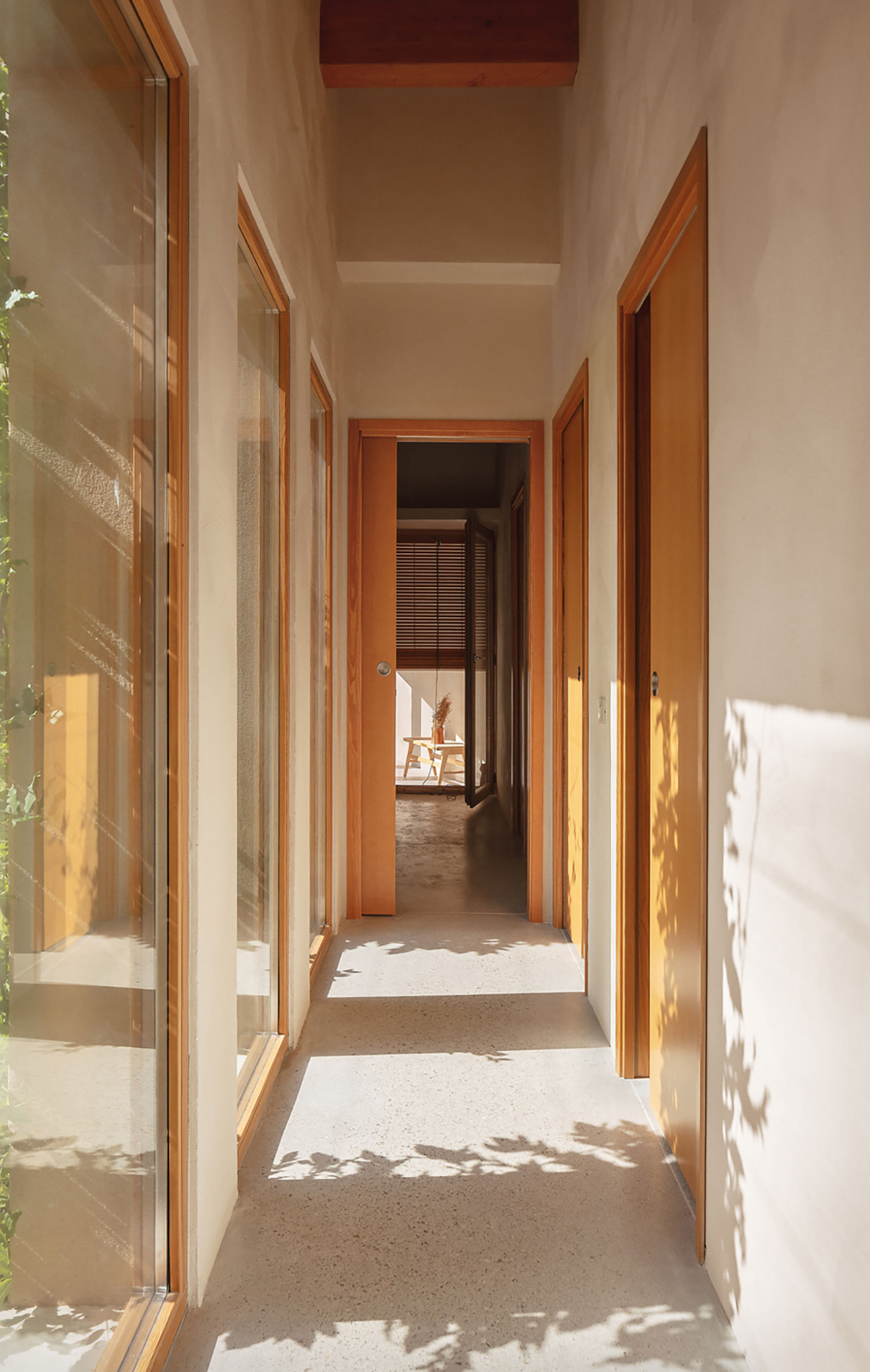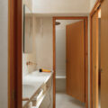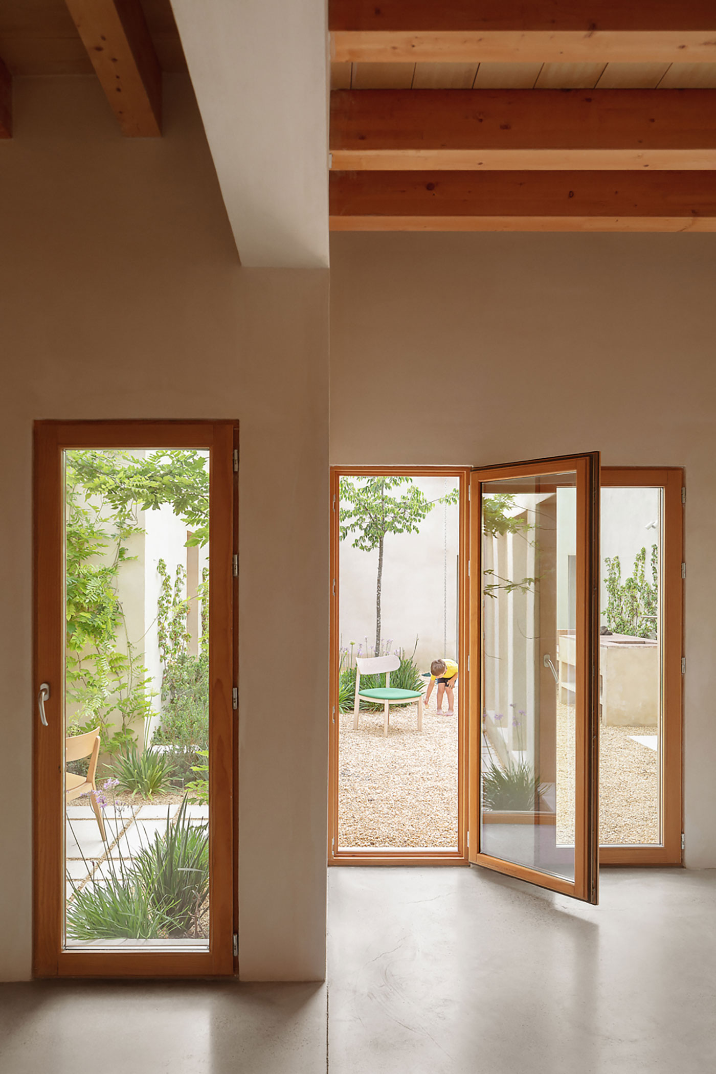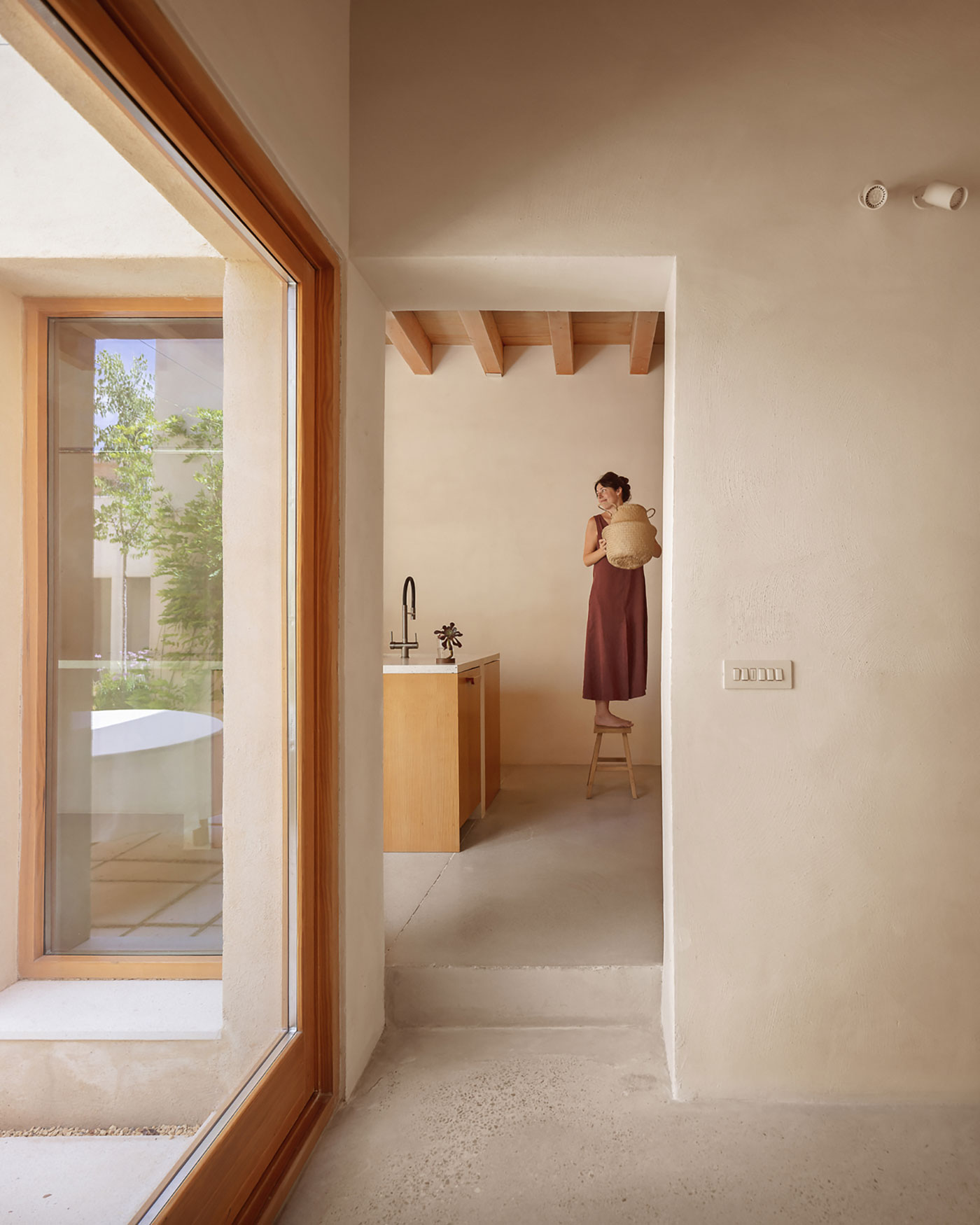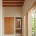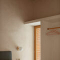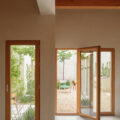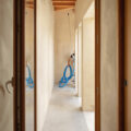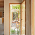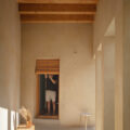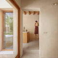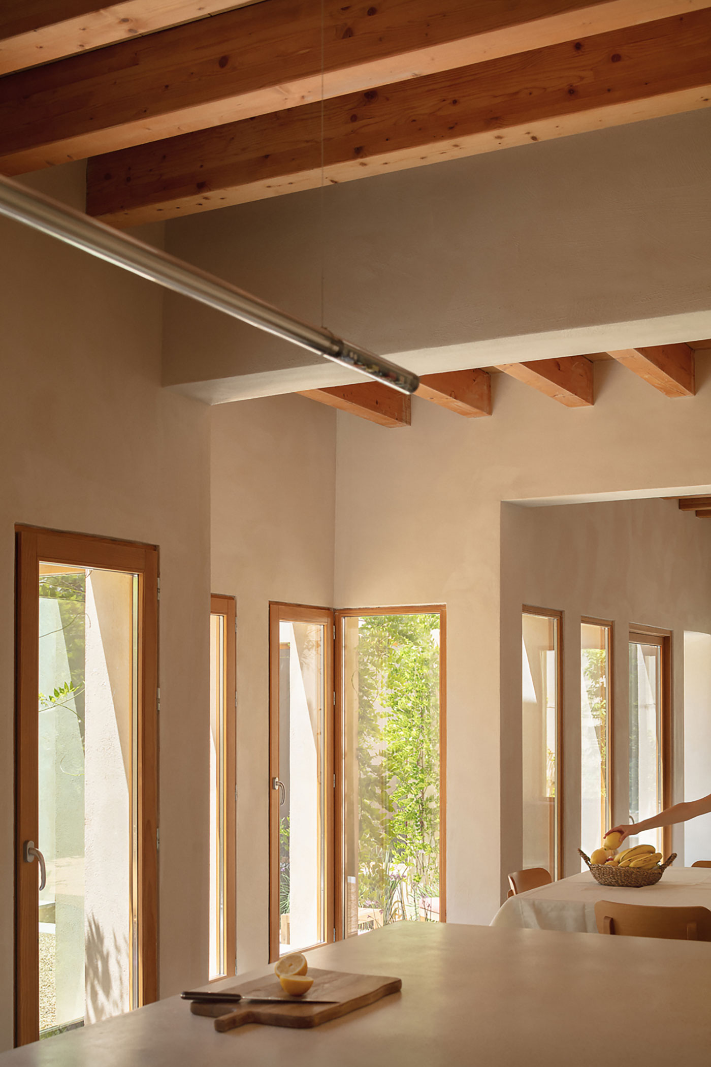 La estructura y las carpinterías de madera aportan calidez y ritmo al espacio. Los revestimientos de cal, yeso y bardo cerámico introducen materiales porosos que respiran y ayudan a estabilizar el ambiente interior.