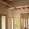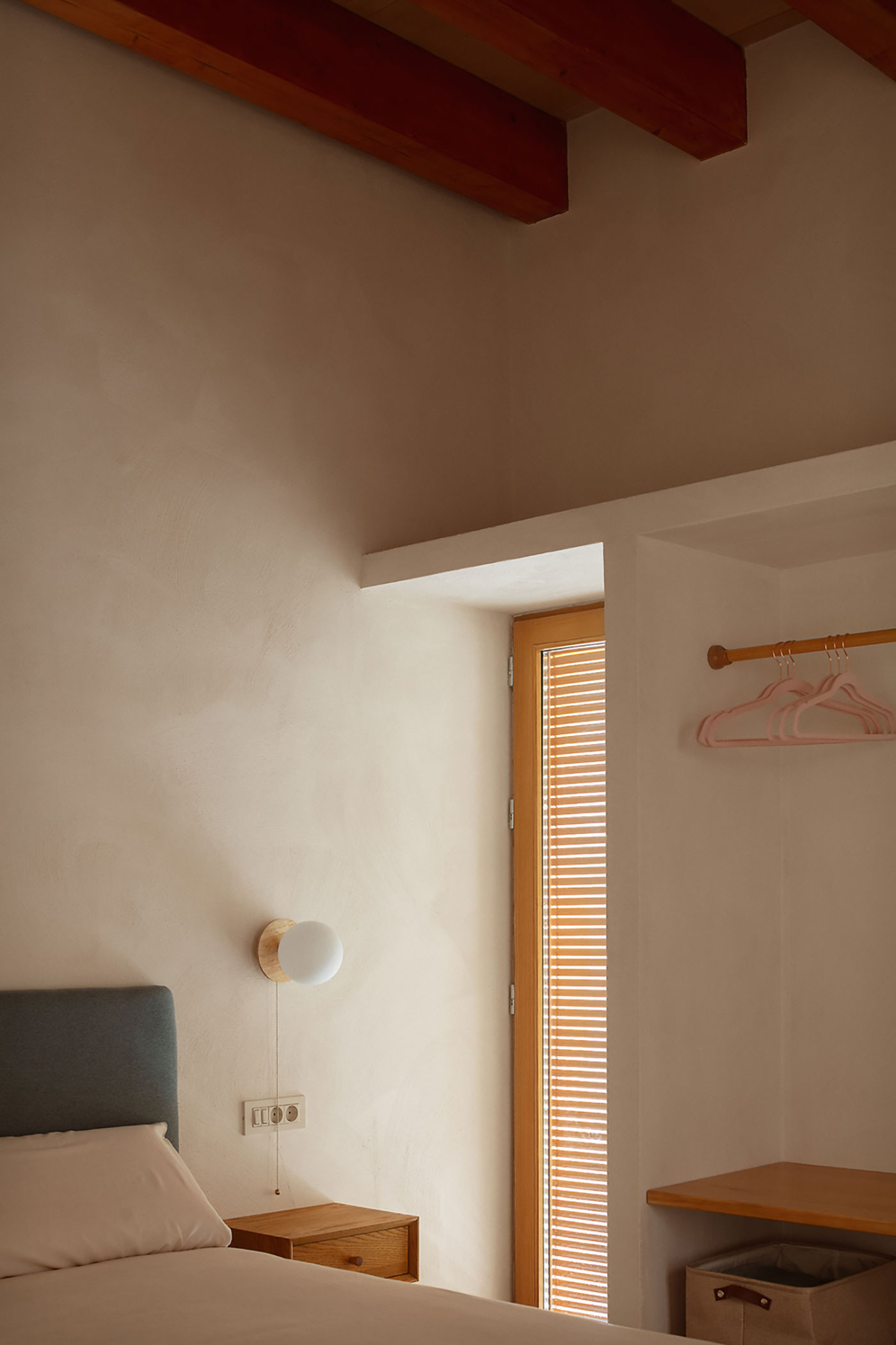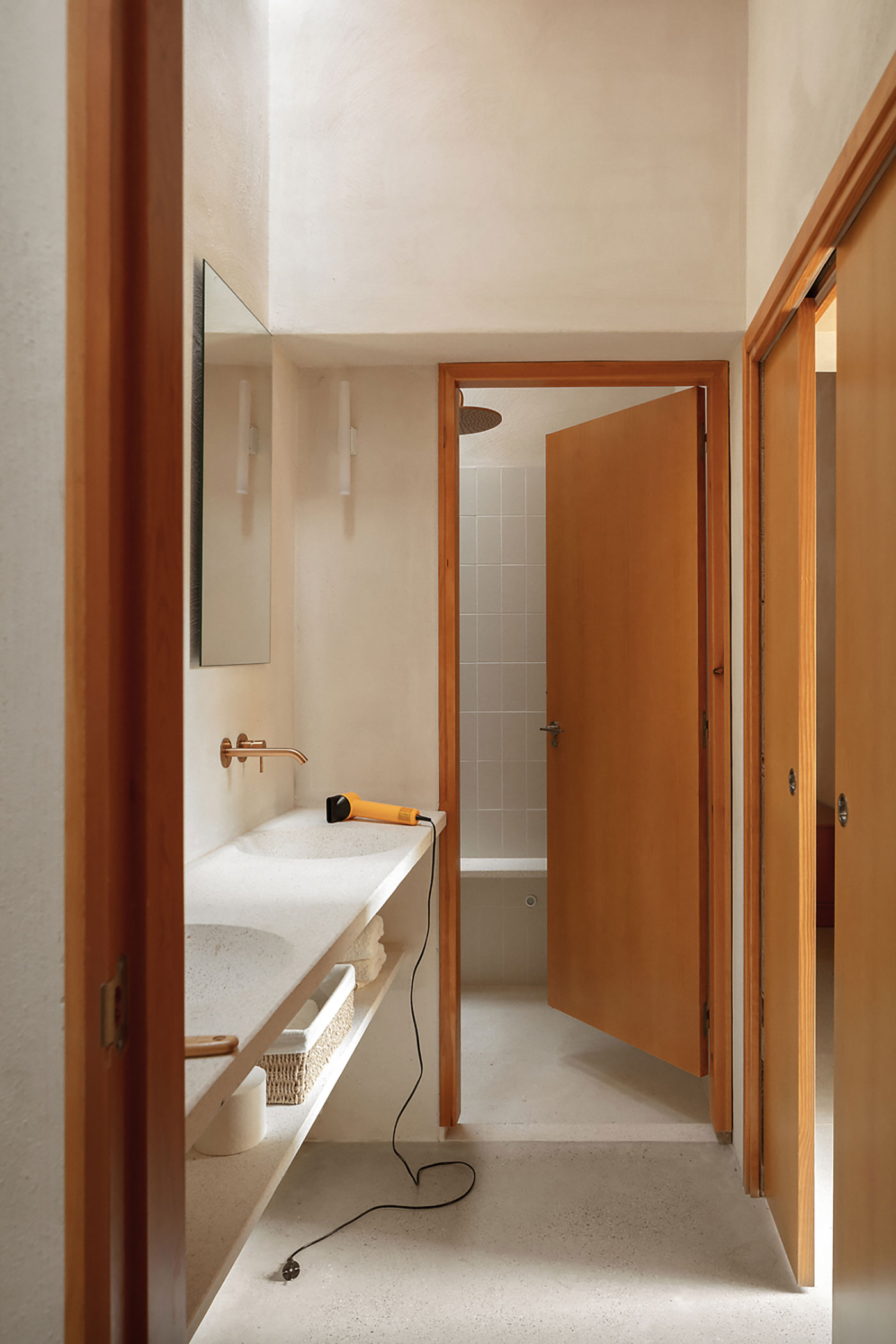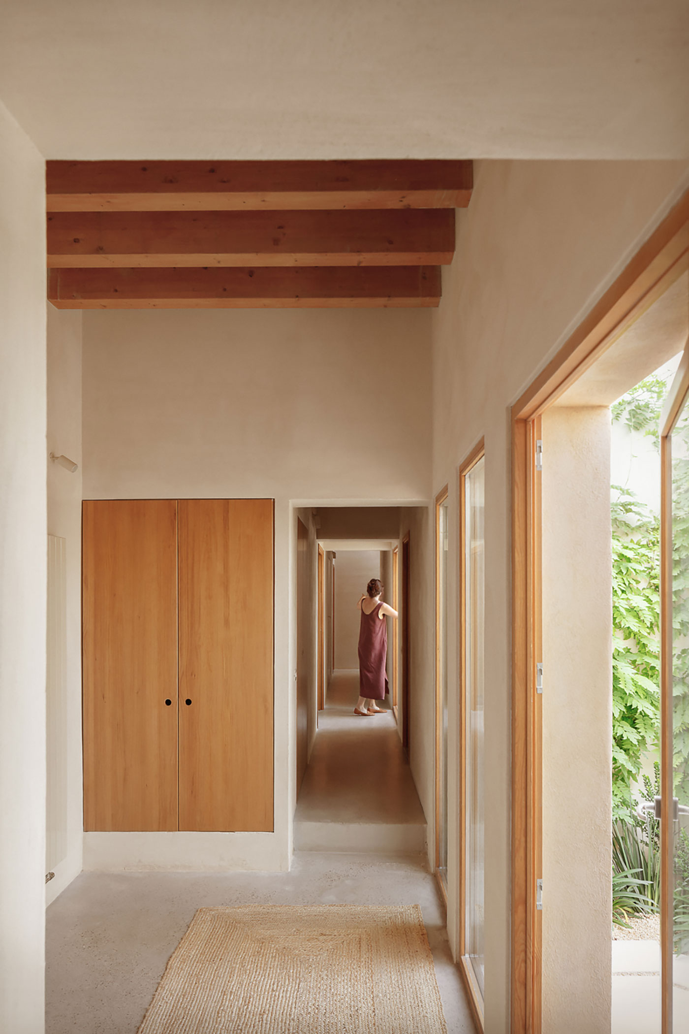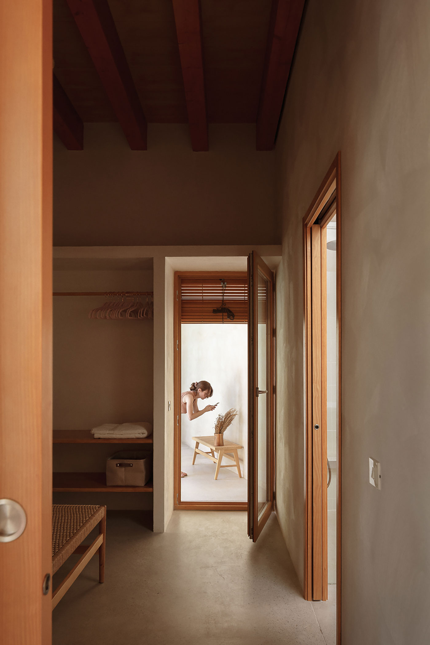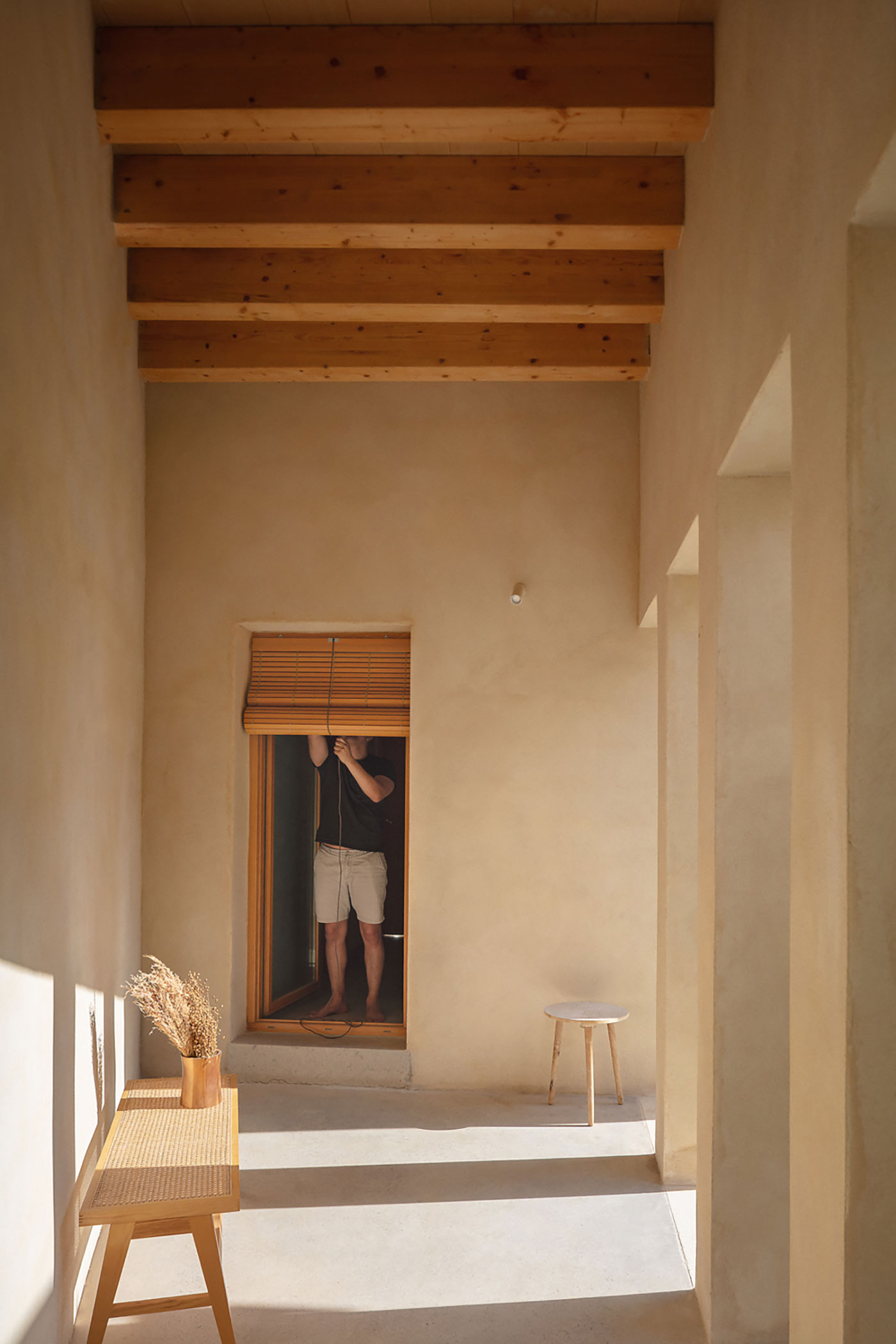 La estructura y las carpinterías de madera aportan calidez y ritmo al espacio. Los revestimientos de cal, yeso y bardo cerámico introducen materiales porosos que respiran y ayudan a estabilizar el ambiente interior.
