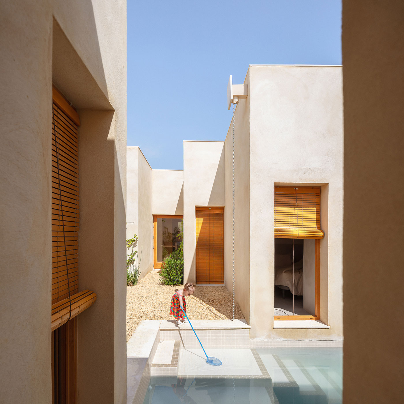 Frente a la curiosidad vecinal por la ausencia de ventanas a la calle, la casa responde con un mundo interior rico y complejo.