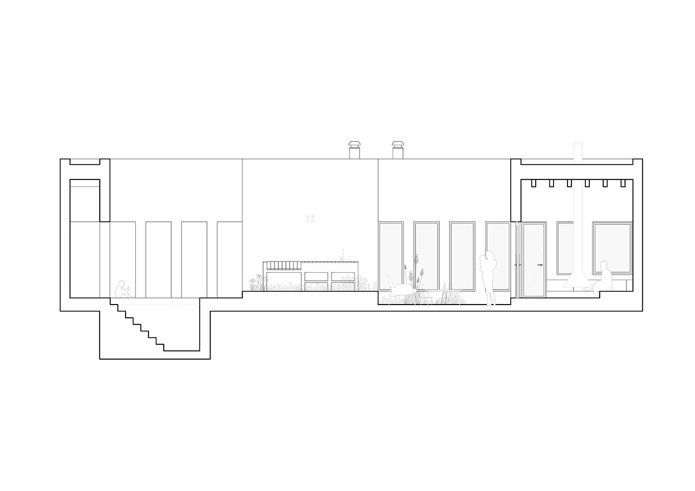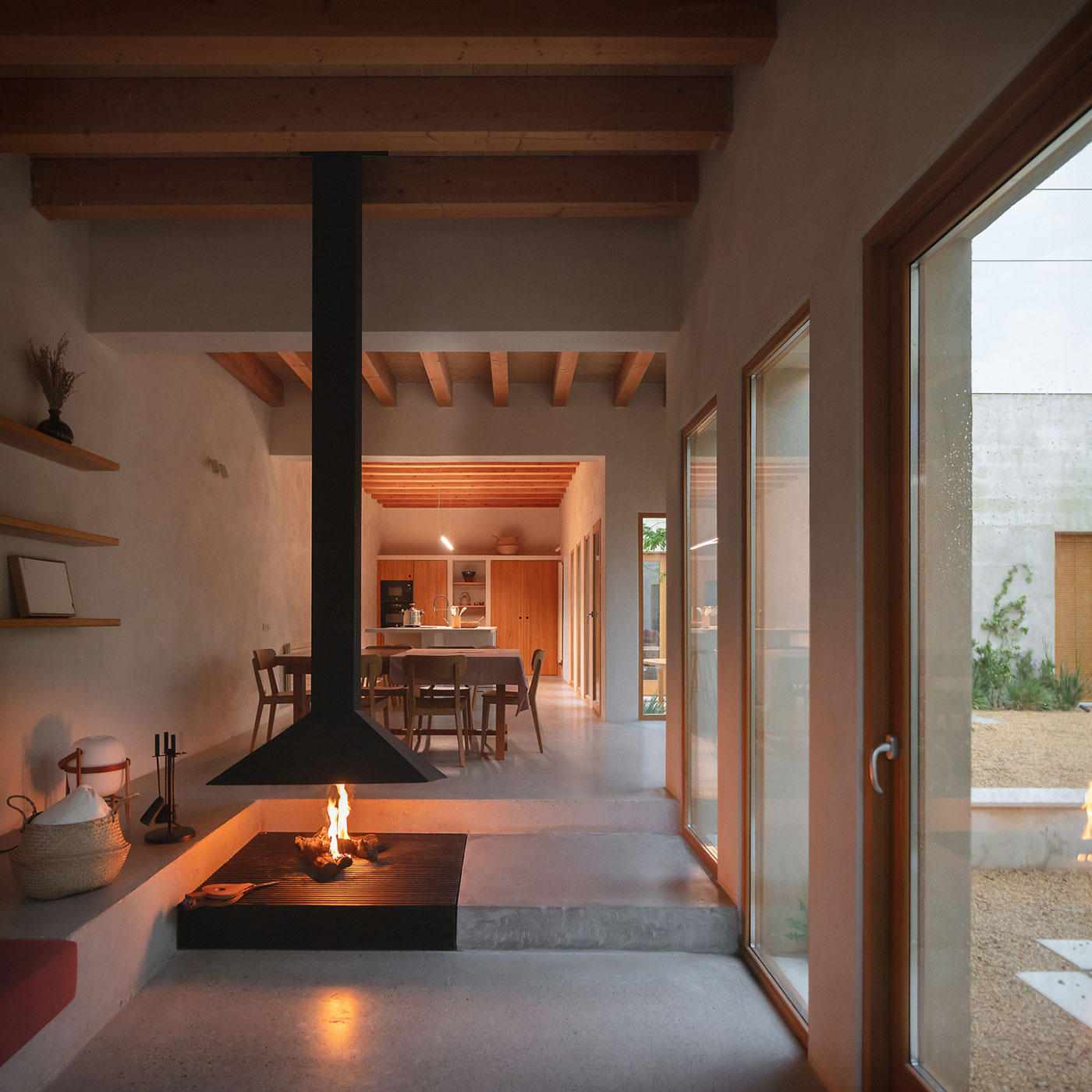 El suelo se moldea generando una suave topografía que acompaña el recorrido y define usos: peldaños que se transforman en bancos corridos o desniveles que acogen la zona de estar frente a la chimenea.