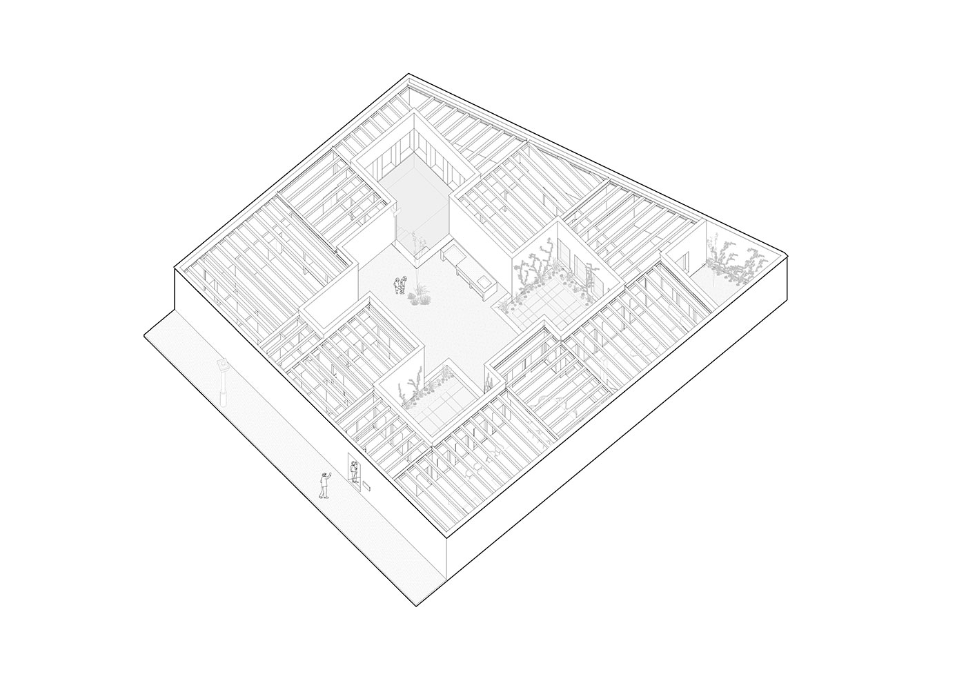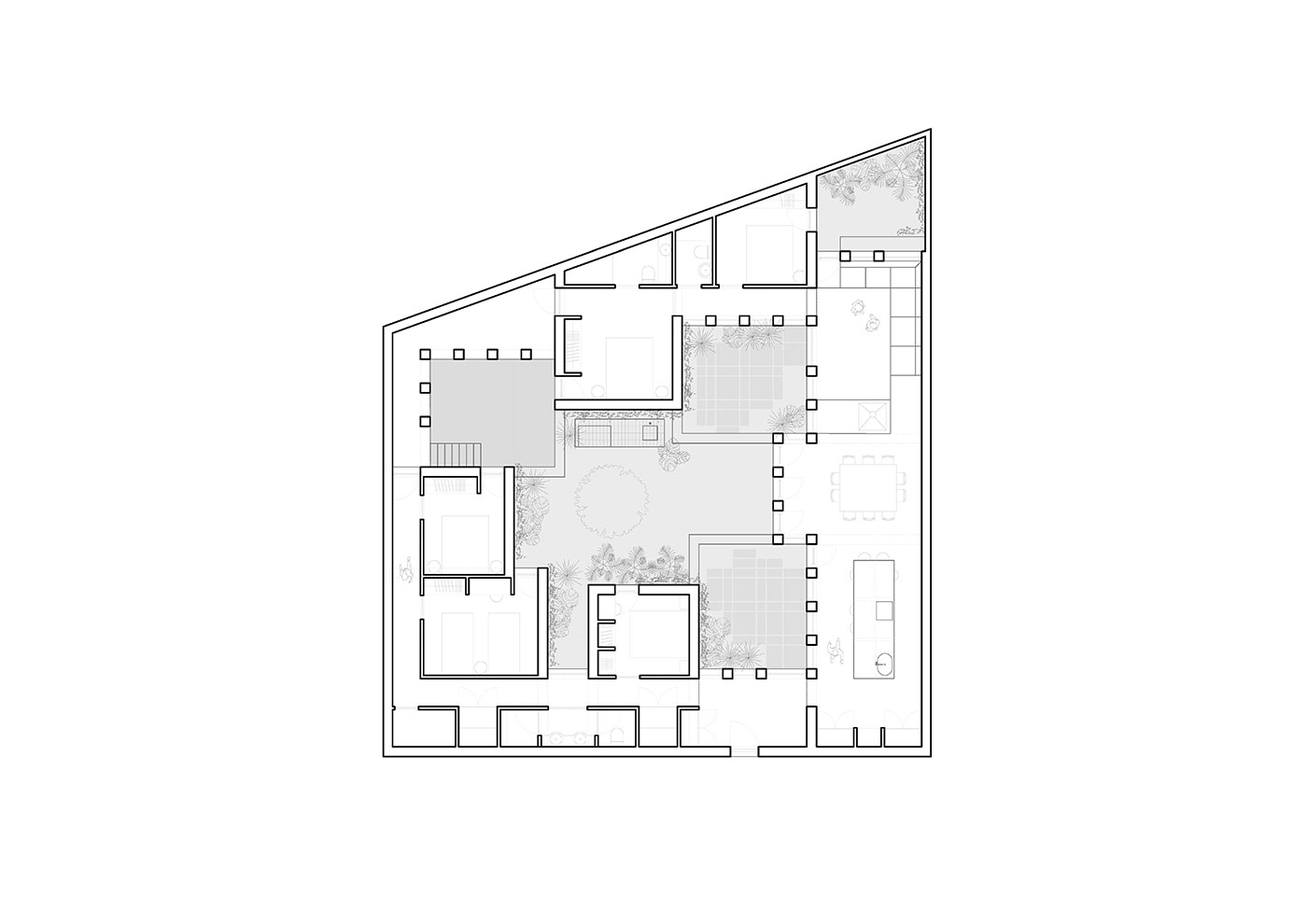 La planta funciona como un claustro doméstico contemporáneo: una sucesión de estancias casi cúbicas que se adhieren a los lindes del solar, mientras el patio liberado se convierte en el corazón de la casa.