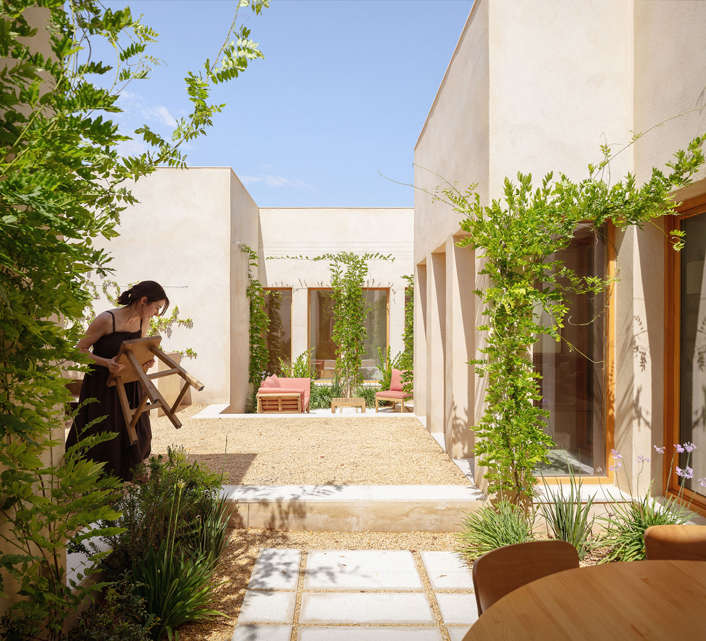La gama cromática se mantiene deliberadamente neutra —blancos, tierras y maderas— para ceder el protagonismo a la vegetación del patio.
