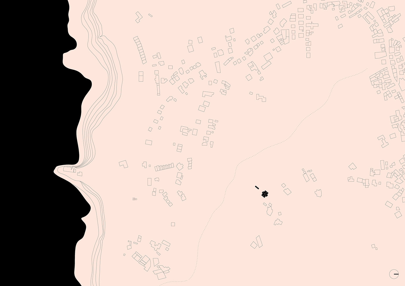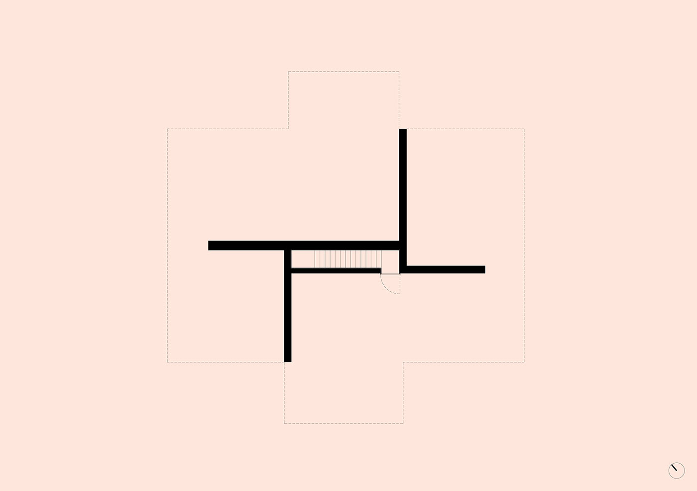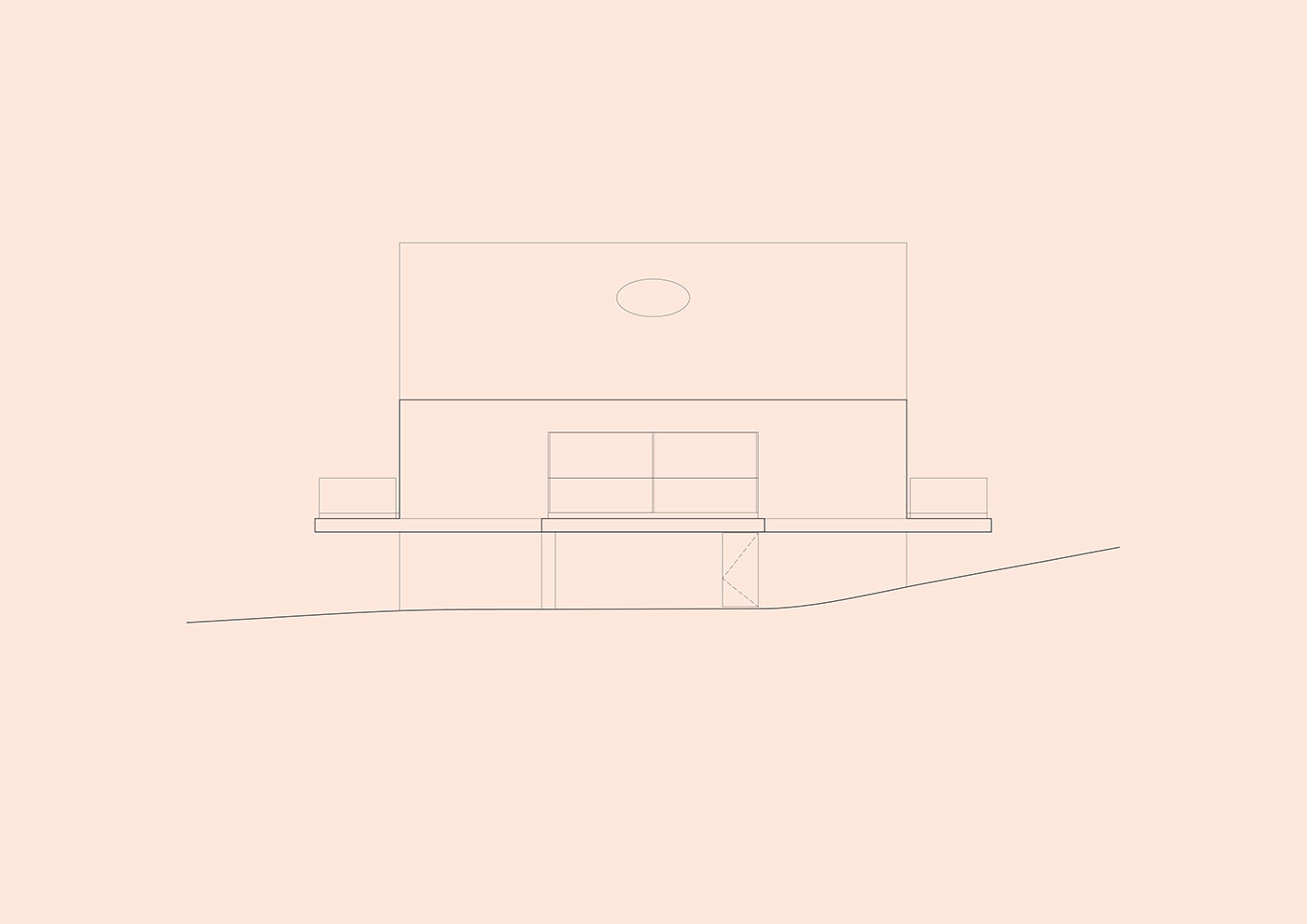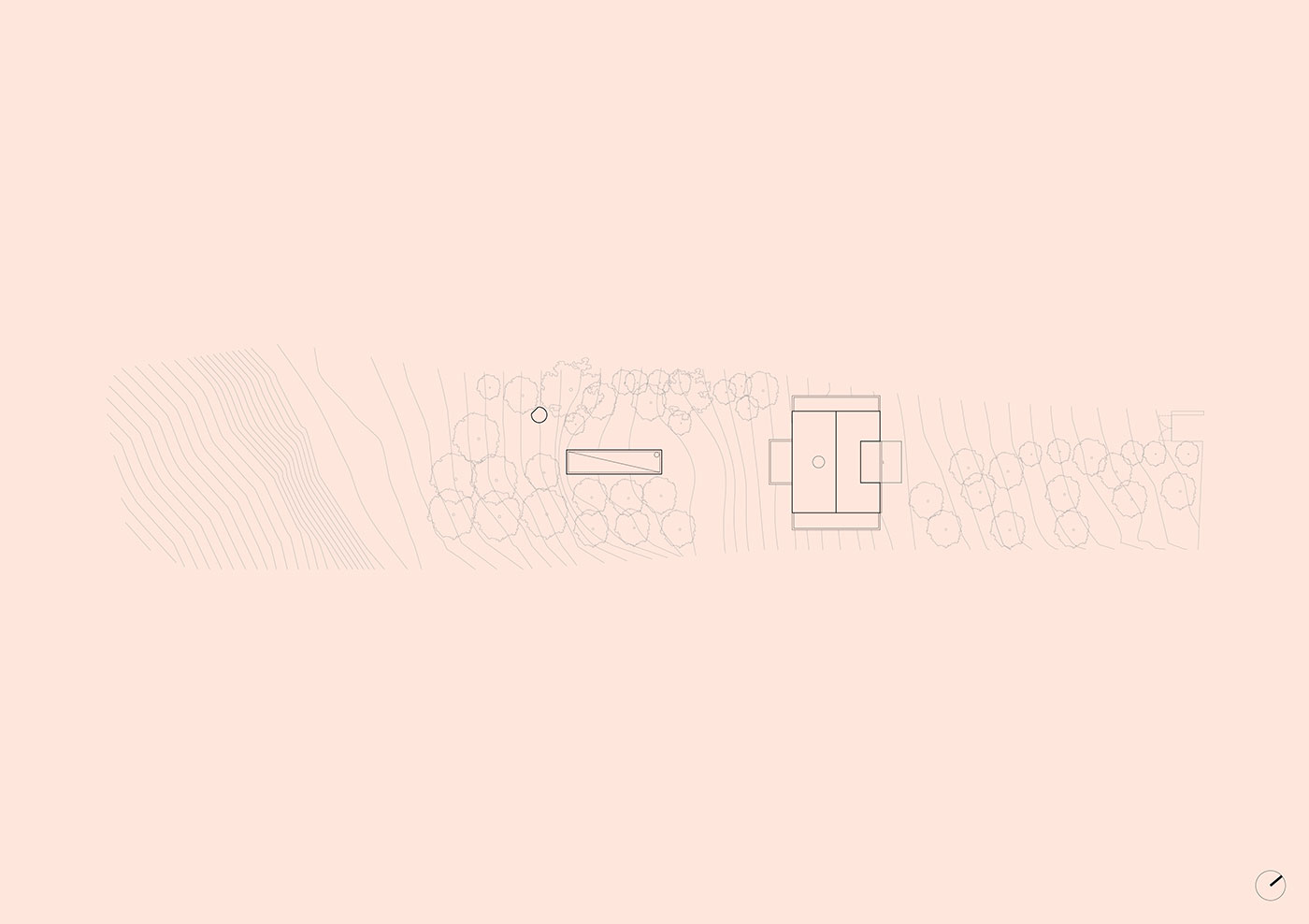 La relación con la topografía fue fundamental: la casa toca el suelo lo más levemente posible, permitiendo que el terreno existente fluya por debajo. Cuatro muros de carga sostienen un podio en forma de cruz sobre el cual se asienta la vivienda, suspendida sobre la tierra. La plataforma solo contacta con el terreno inclinado en un punto, el acceso, mientras que en los demás lados se abren terrazas que flotan en todas direcciones, prolongando el espacio interior hacia el exterior y otorgando a cada estancia su propio refugio privado.