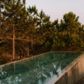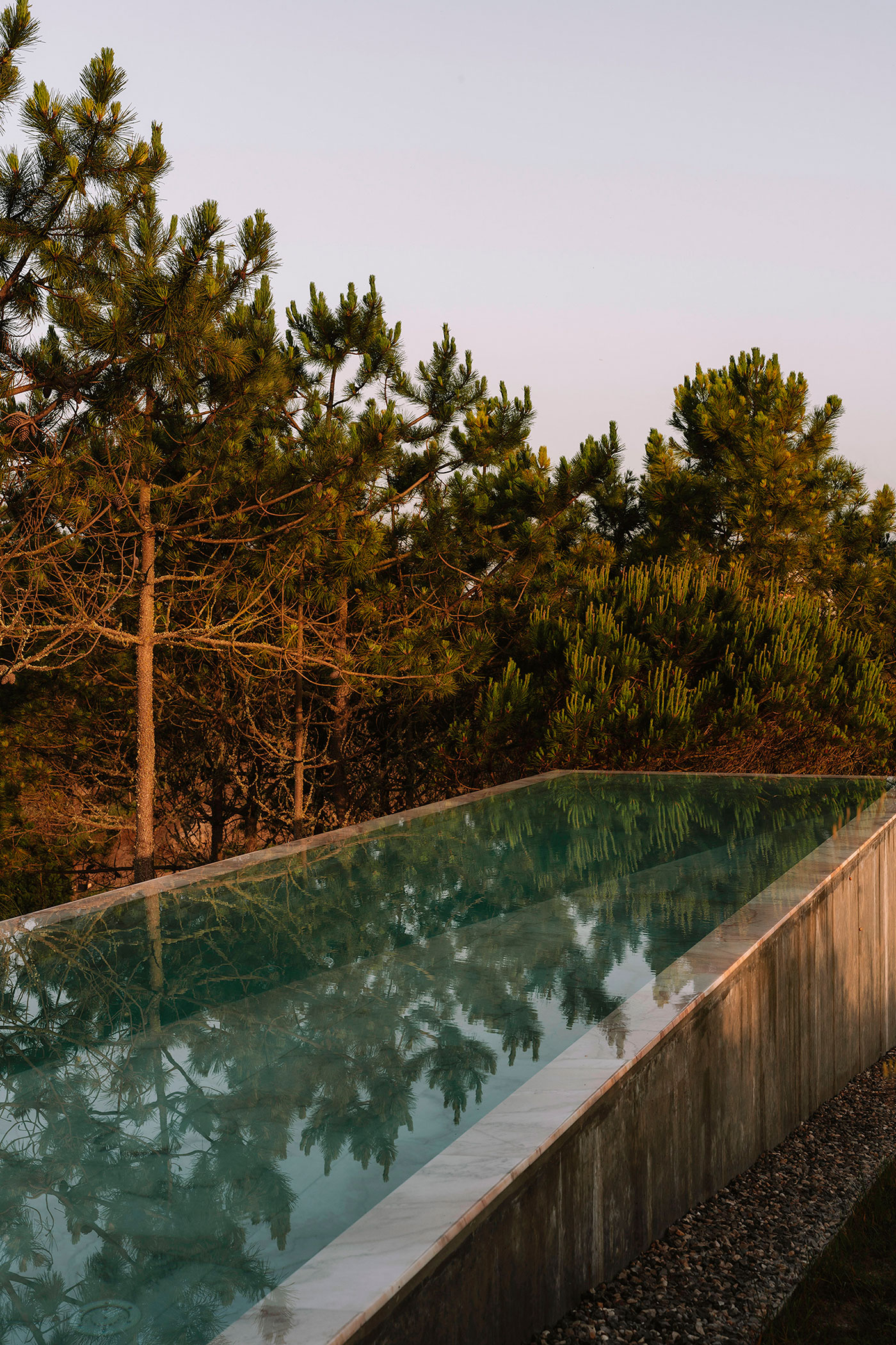 En el exterior, una piscina longitudinal se emplaza entre pinos silvestres, paralela al mar. El paisaje apenas se modificó: se conservaron todos los árboles existentes y se plantó una retícula de frutales en las laderas, preservando así el carácter agrícola del entorno.