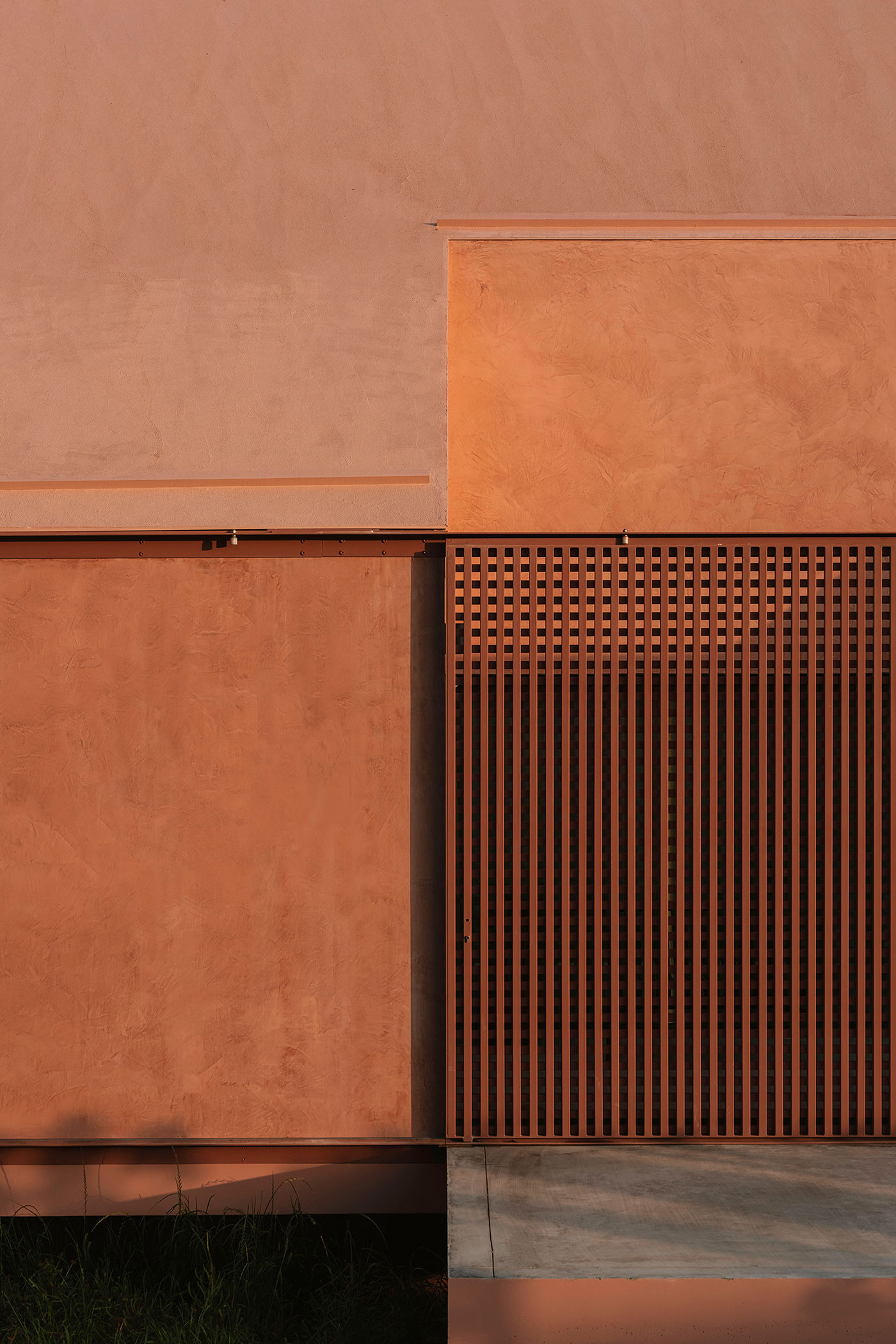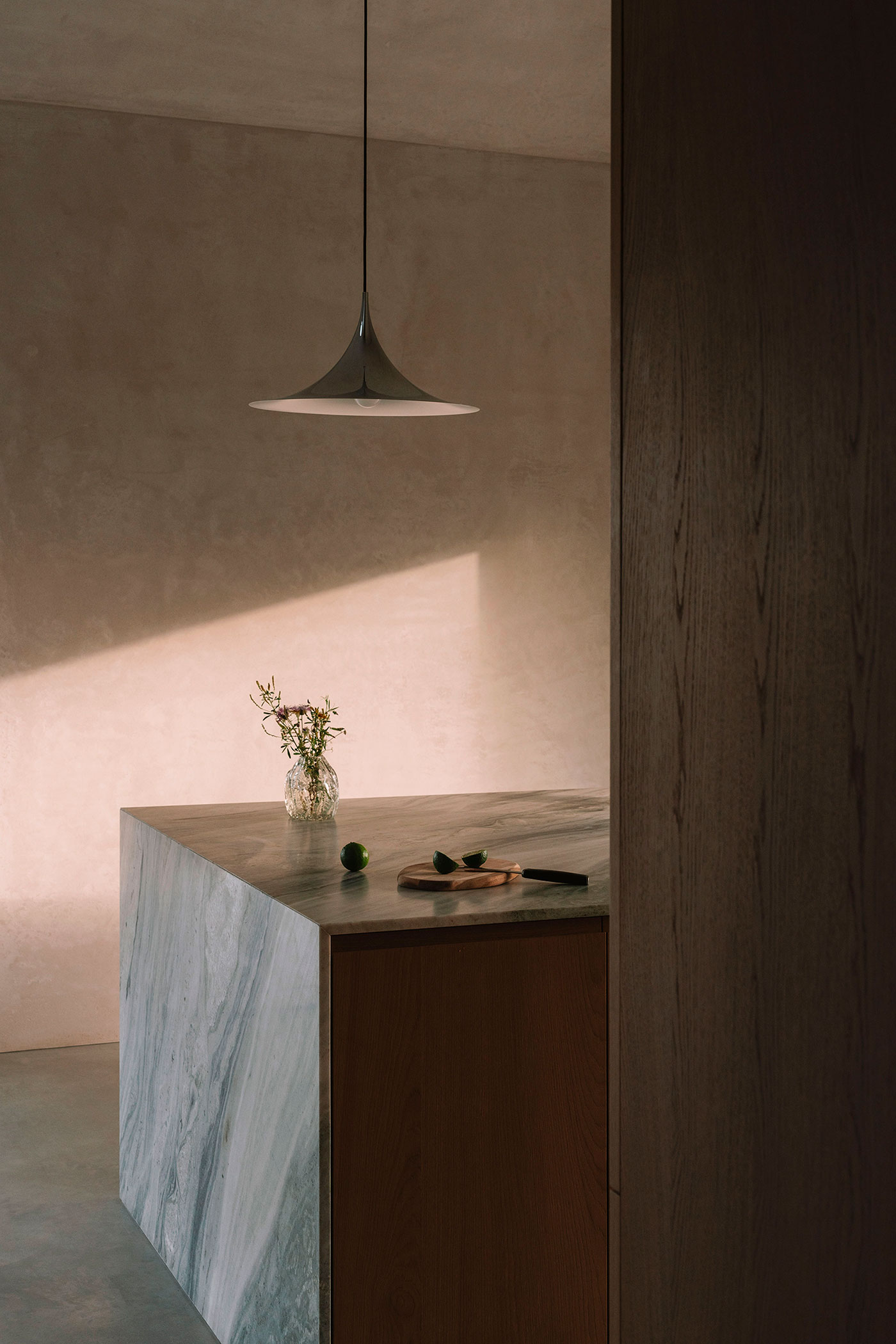 El estrecho diálogo entre clientes y constructor durante la obra permitió que el tiempo, el azar y el conocimiento de los trabajadores dejaran su huella en la vivienda. Los muros enlucidos de gris quedaron desnudos, conformando un interior monocromo. Se añadieron nuevos óculos y hornacinas donde fue posible, una puerta metálica en la escalera se sustituyó por vidrio rojo, se eligieron travertino iraní plateado y mármol verde azulado para armonizar con los muros interiores, y el exterior, pensado inicialmente en gris, acabó adquiriendo color.