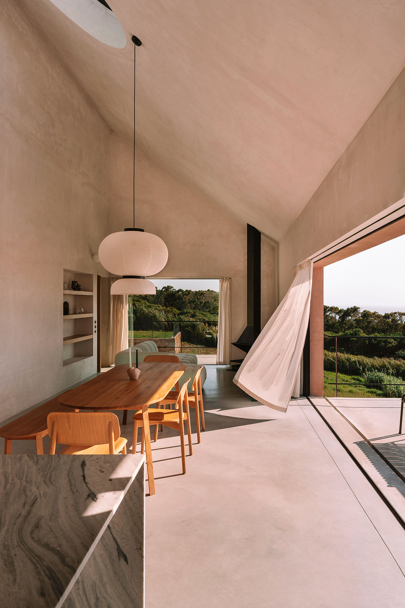 Sencillos recursos arquitectónicos habilitan y fomentan la flexibilidad y la informalidad. Las ventanas se retraen completamente en los muros, transformando la casa en un gran espacio al aire libre, extendiendo el interior hacia el exterior y permitiendo que momentos como el baño se conviertan en experiencias a cielo abierto.