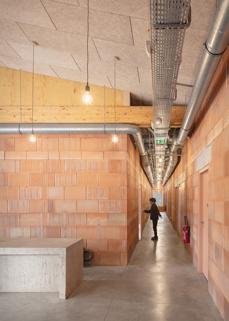 La forma y la materialidad del edificio rinden homenaje al patrimonio arquitectónico de esta periferia cercana a París, en particular a los edificios de viviendas sociales construidos en ladrillo.