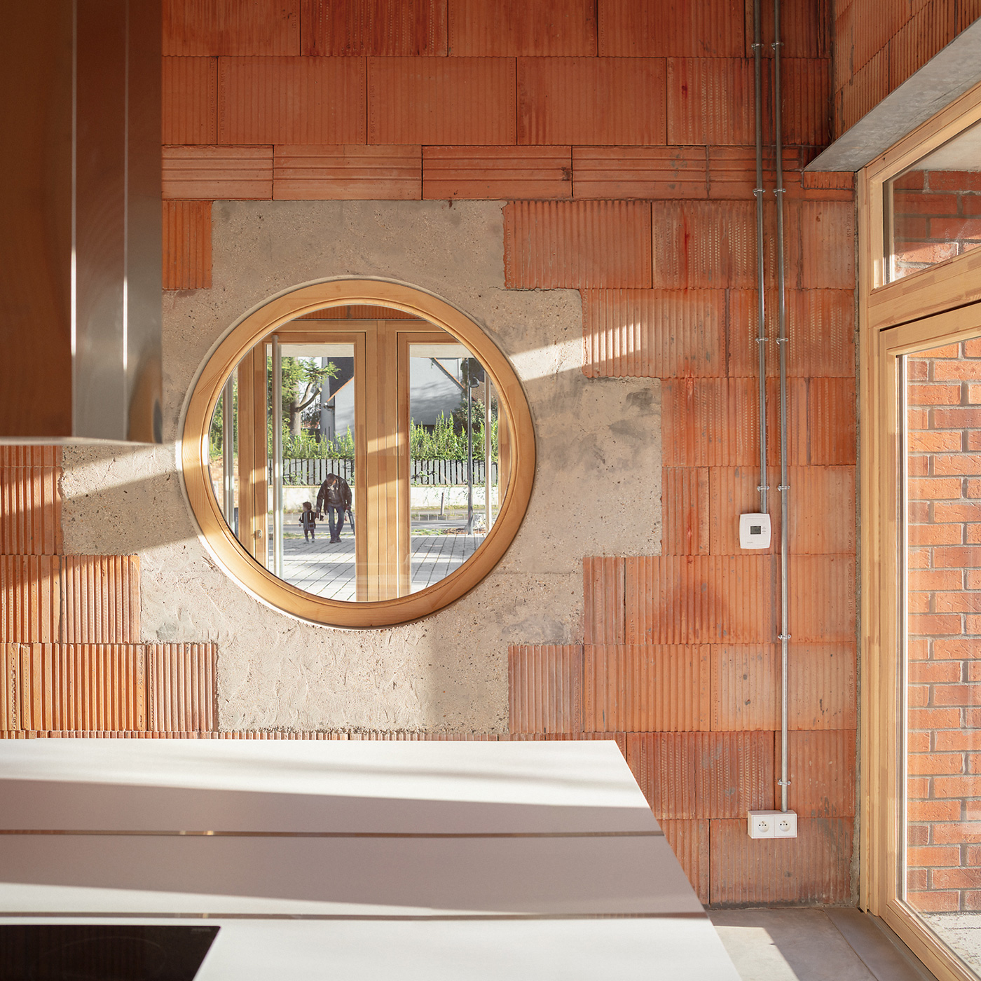 En el interior, los revestimientos y tabiques de ladrillo hueco visto, con un espesor de 15 cm, aportan una notable solidez. Este material, deliberadamente masivo, proporciona inercia térmica, contribuyendo así al confort interior.