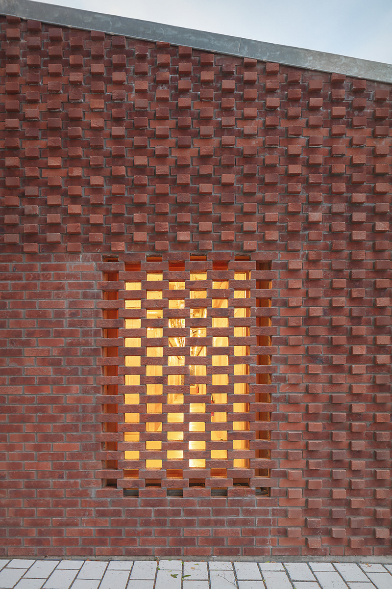 Las fachadas exteriores de ladrillo presentan un sutil juego de aparejos, integrando secciones transparentes con celosías, relieves y elementos verticales que marcan las líneas portantes.