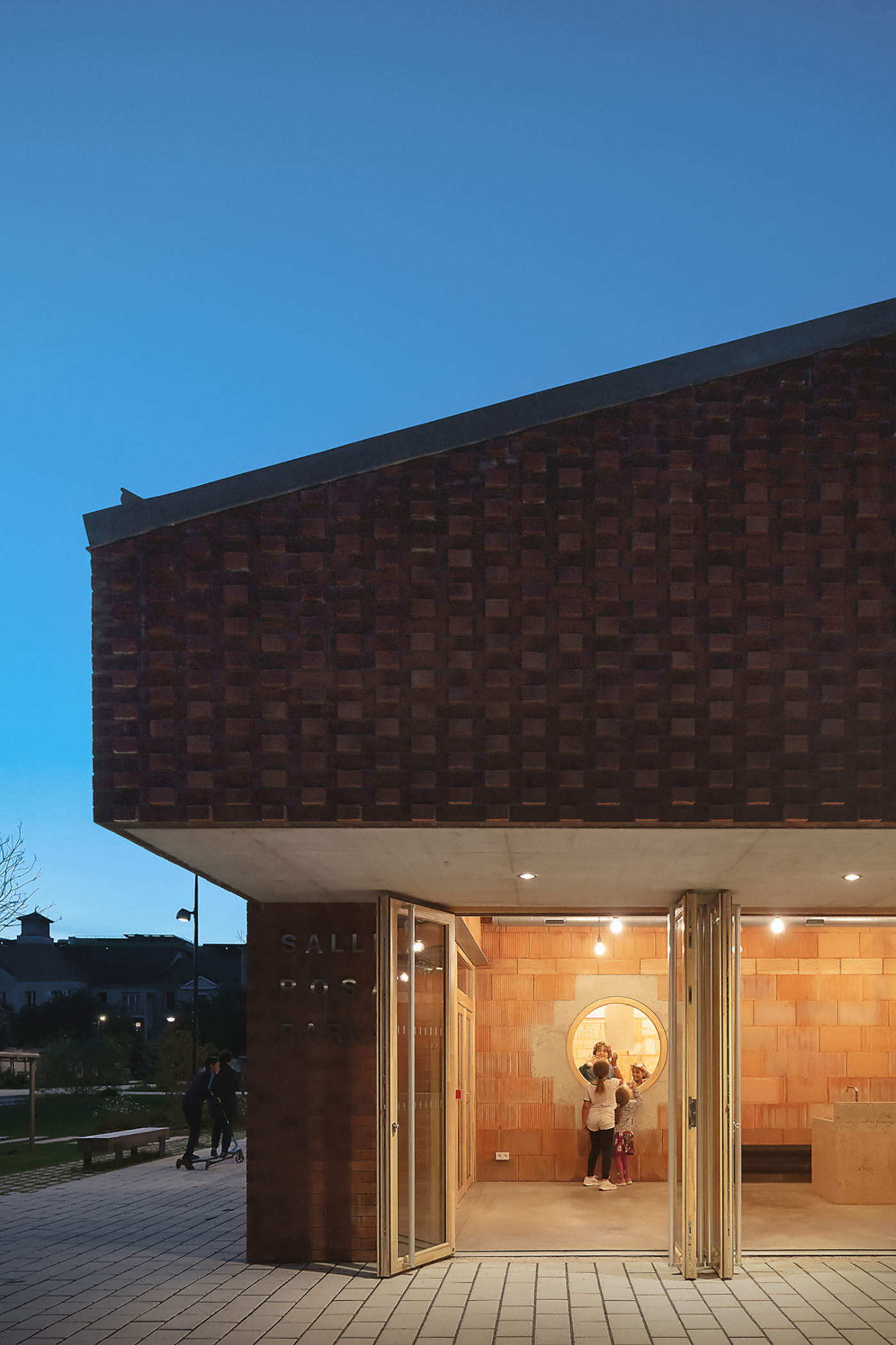 - La fachada oeste, completamente acristalada, permite que los espacios interiores aprovechen al máximo la vista del parque. Compuesta por puertas de vidrio dobles, puede abrirse completamente para extender las actividades al exterior.