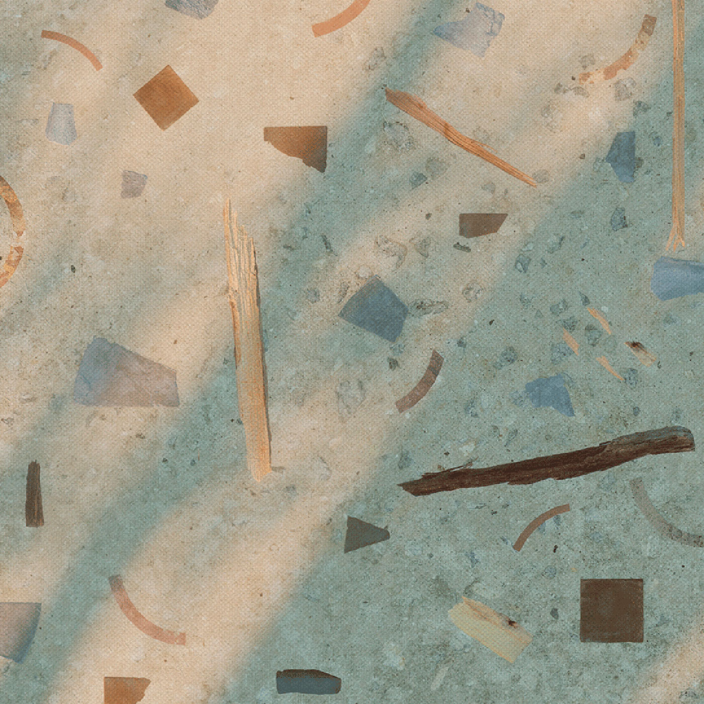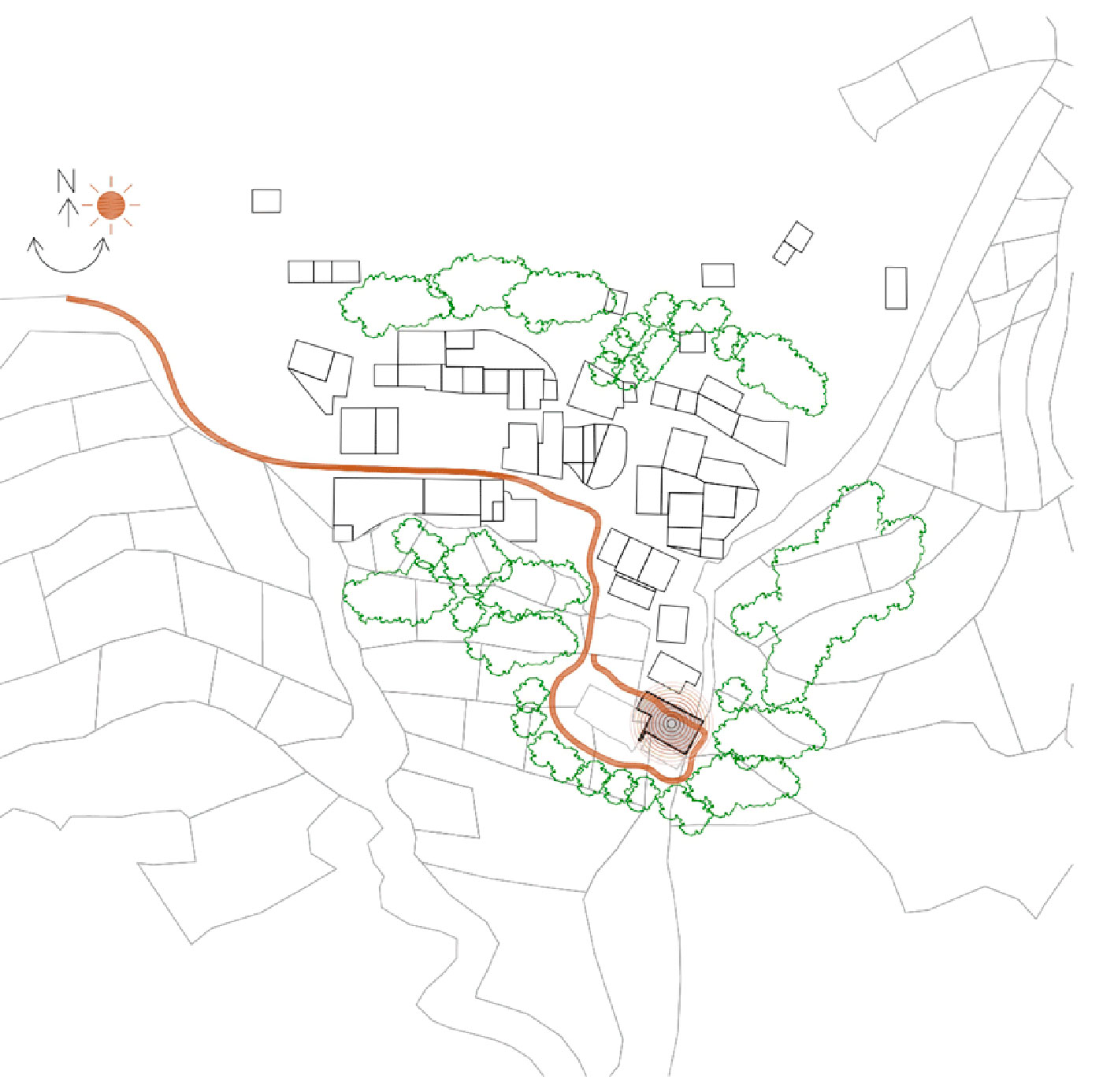 Iniciando el descenso entre las últimas de las viviendas, una alfombra de hormigón desactivado nos recoge y siguiendo las piezas longitudinales de gres, nos acompaña en el descenso entre bancales hasta la balsa. En su esquina el aparejo cambia y las piezas de gres dibujan unas geometrías concéntricas que indican un nuevo acceso al agua de manera más segura y accesible.