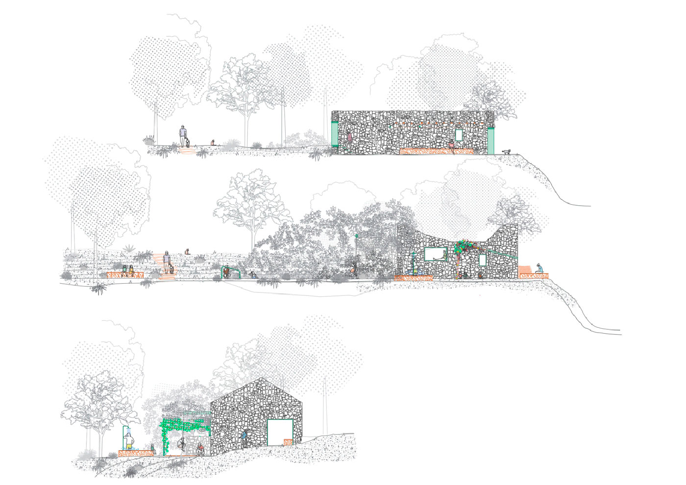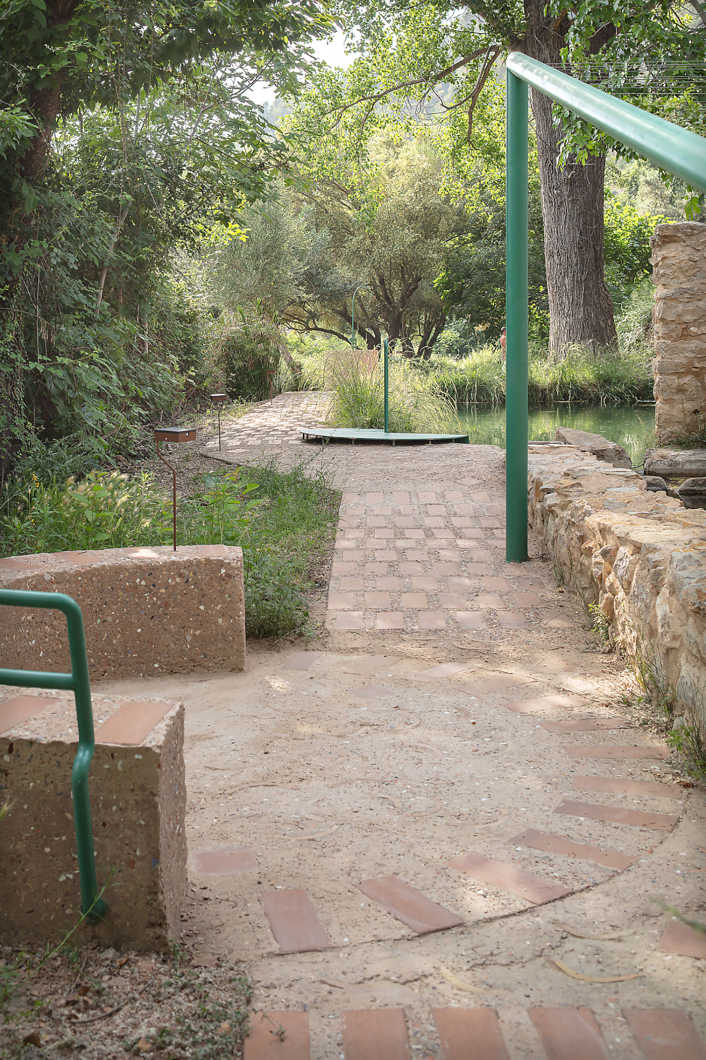 Se trata de una propuesta de mínimos, casi de acupuntura, de incidir en los enclaves destacados del recorrido para mejorar la experiencia de la estancia y el recorrido. La posibilidad de conversar y de continuar haciendo comunidad, bien seas un habitante de la aldea o un visitante puntual, se da en diferentes espacios: bajo la sombra de un olivo, junto al muro del lavadero, en un baño refrescante en la balsa u observando y aprendiendo de los trabajos que hasta hace no tantos años se desarrollaban en el interior de la almazara. La posibilidad de observar puede darse en el instante del encuentro con la vista proyectada hacia el valle o en el devenir del paseo a lo largo del recorrido pavimentado salpicado de hitos.