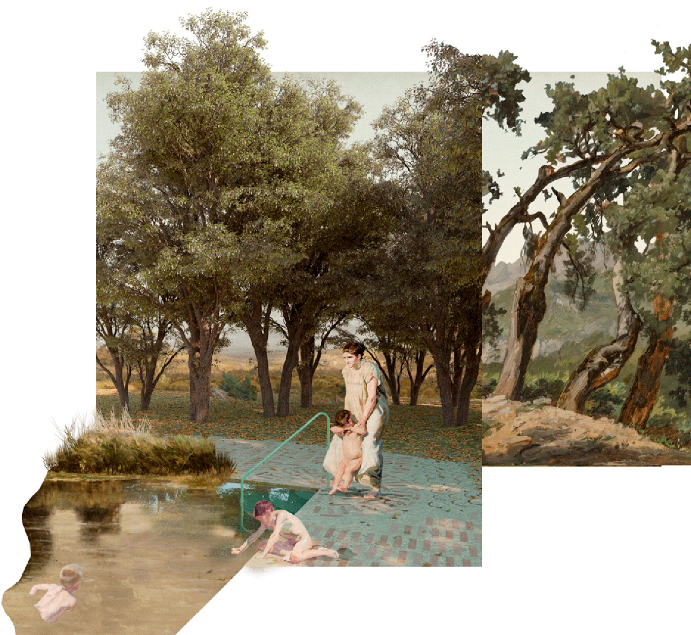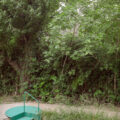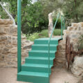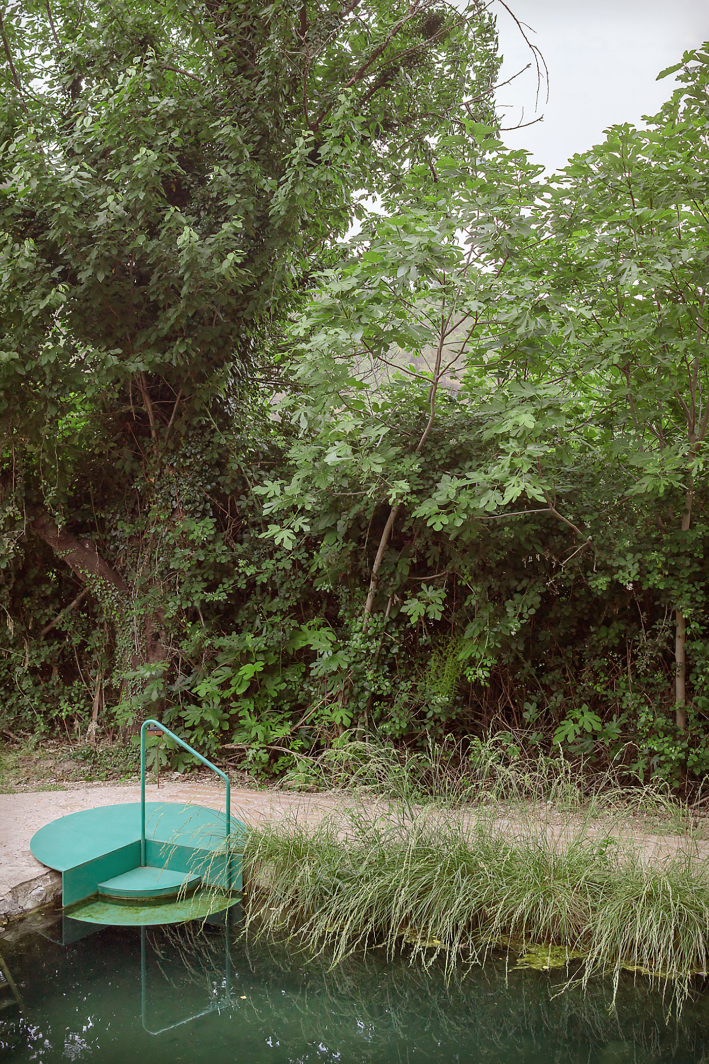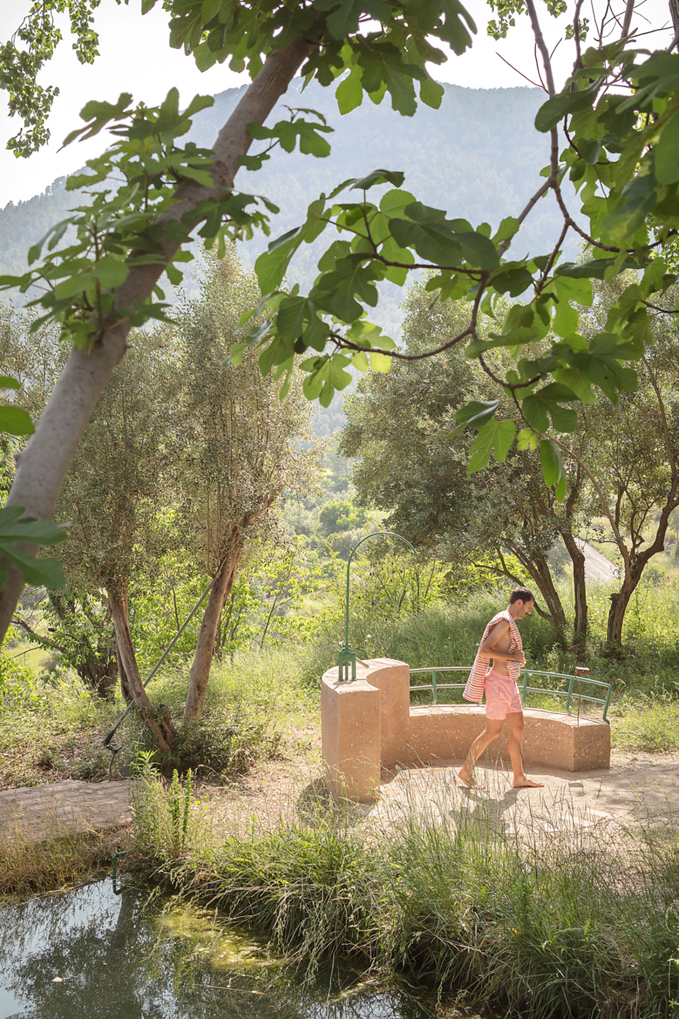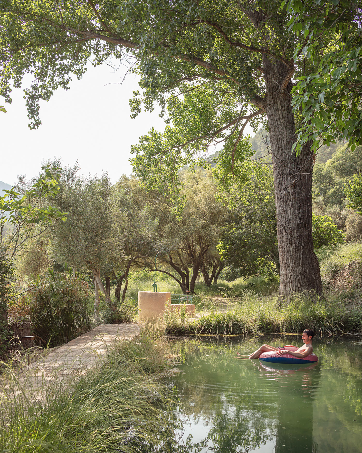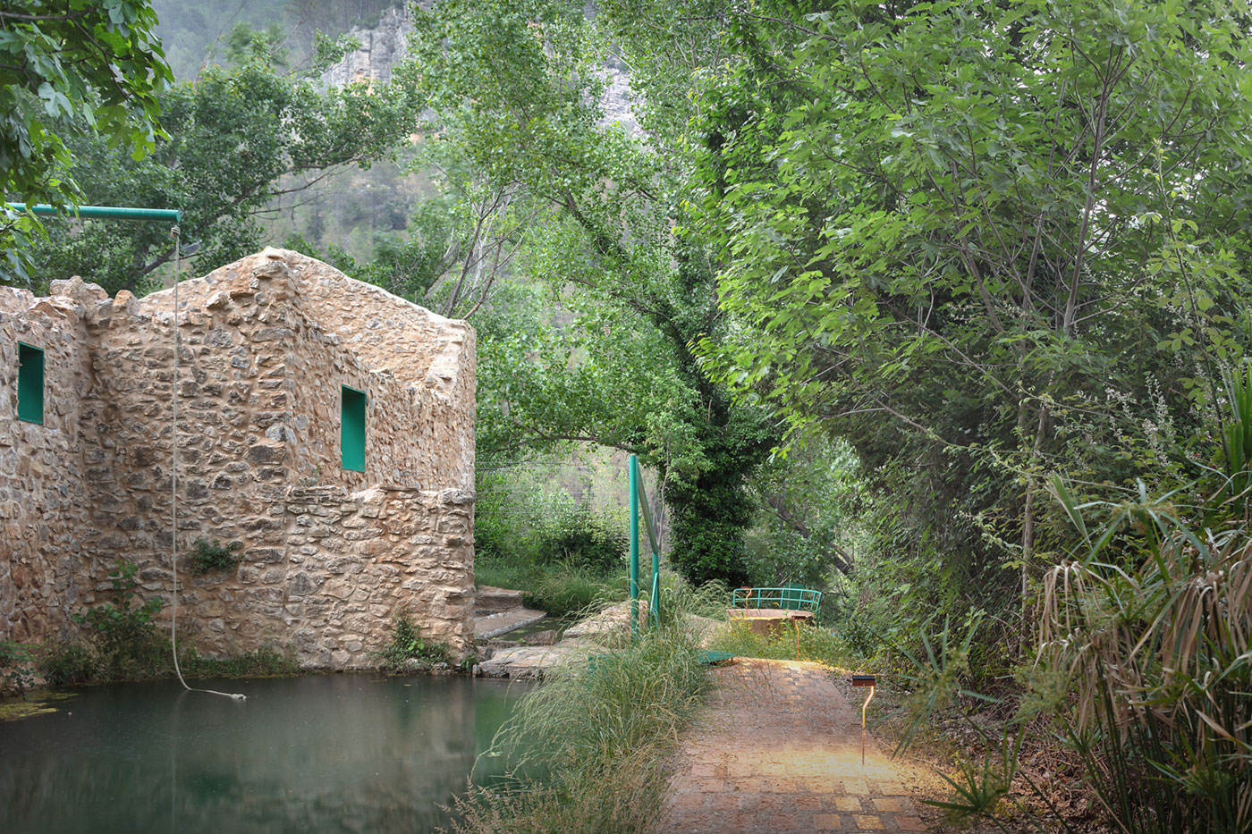Para finalizar el recorrido de la intervención y, antes de volver a retomar el camino que atraviesa las vivienda de la aldea, en uno de los muros que conforman la antigua almazara aparece una viga en voladizo en la que se anuda una cuerda para poder trepar y desde la que lanzarse al agua entre la sombra de la higuera, reproduciendo la que ya existía colgada entre las ramas.