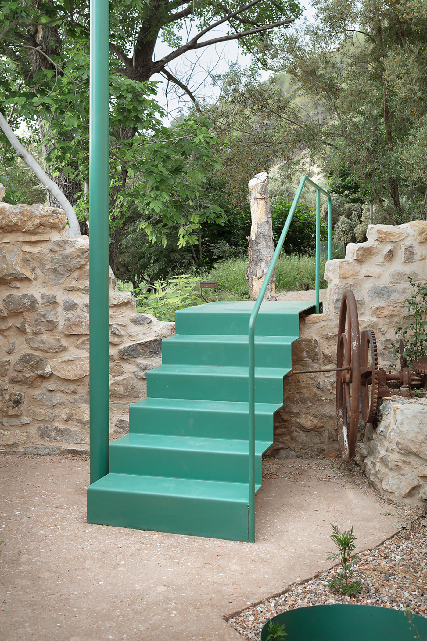 Continuando el paseo, por fin la antigua almazara.. Este espacio se incorpora al recorrido que se decide hacer pasar por dentro del edificio. De esta manera, un marco metálico verde que hace de dintel y jambas de la antigua puerta de acceso nos recibe. En su interior, pequeños huecos escogidos en la fachada que queda tras el lavadero, orientado al sur, enmarcan el paisaje.