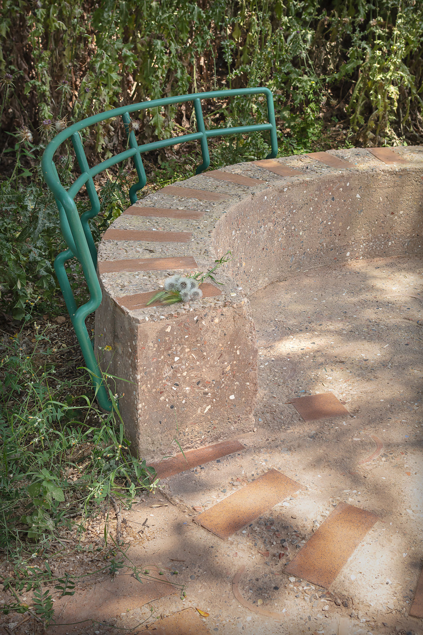 Sobre la fachada norte un banco corrido forrado de cerámica, permite observar el espacio, conocer su historia y disfrutar de las vistas escogidas o descansar y encontrarse con otros vecinos y visitantes. Una pequeña escalera salva la diferencia de cota existente entre el interior de los restos de la almazara y el exterior.