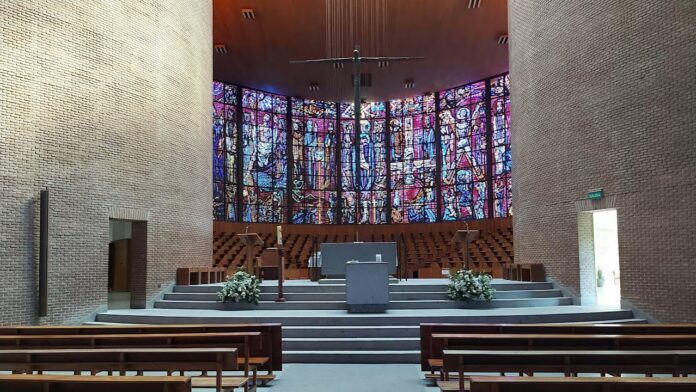 Vista de la Iglesia de San Pedro Mártir de Madrid (España), en el nº 204 de la Avenida de Burgos. Proyectada en 1955 por el arquitecto Miguel Fisac y construida de 1959 a 1960 © Luis García | Fuente: wikipedia.org