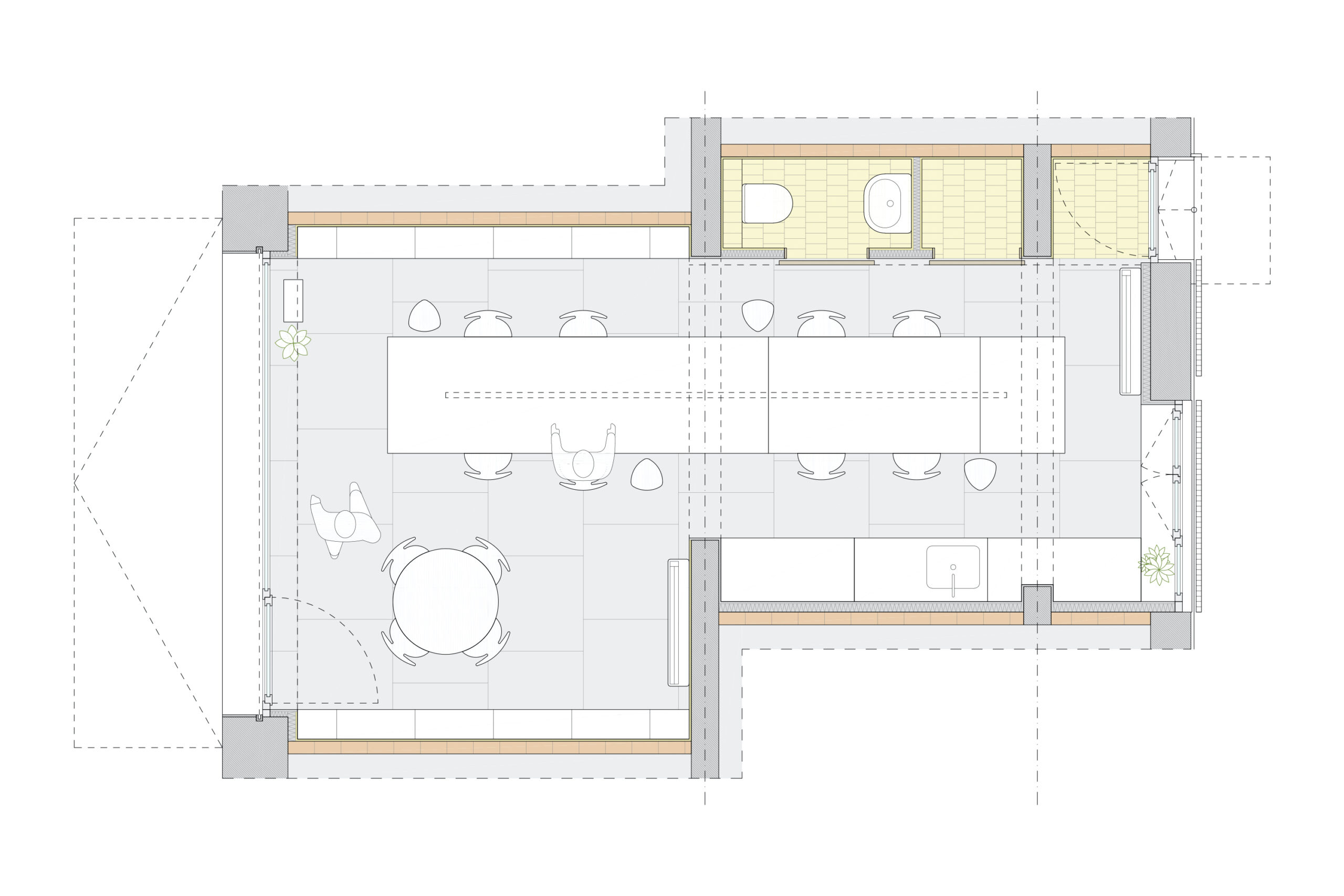 Se trata de un espacio único en el que se dispone una mesa en la que trabajamos de forma libre, con una ubicación de cada persona más o menos aproximada y en la que nos vamos situando según tareas o colaboraciones, propiciando así una forma de trabajo libre, flexible y fácilmente adaptable a distintas configuraciones. En este espacio, la parte más pública y más visible (zona de trabajo permanente y zona de reuniones), se sitúa en cabeza, hacia la plaza, y la zona de servicio (office, aseo, almacenamiento) hacia el fondo.
