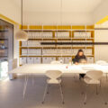El temor al lienzo en blanco nos ayudó a resolver la materialidad del estudio, mediante la sucesión alterna de planos de baldosa cerámica amarilla de pequeño formato que otorga cierta identidad, identifica la intervención con nuestra imagen enlazándola directamente con su anterior uso. Estableciendo a su vez, un contraste con el blanco predominante en el mobiliario y el material que habitualmente se suele emplear en arquitectura: el papel.