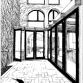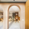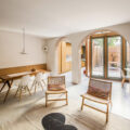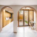 La nueva fachada de la ampliación se separa de la vertical de la finca mostrando los dos arcos que originalmente encerraban el espacio interior y que ahora actúan como tránsito entre el salón–comedor y la nueva galería con la cocina y el estudio. Al separar la fachada de la vertical de la finca, la nueva envolvente se libera de las directrices del edificio existente, realizando unas pequeñas inflexiones que permiten más espacio en las zonas de mayor actividad, tanto en el interior como en el propio patio.