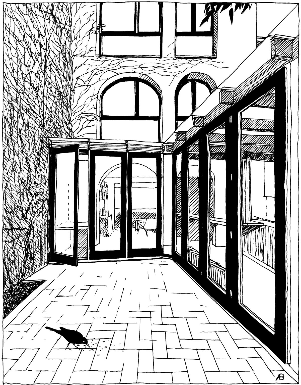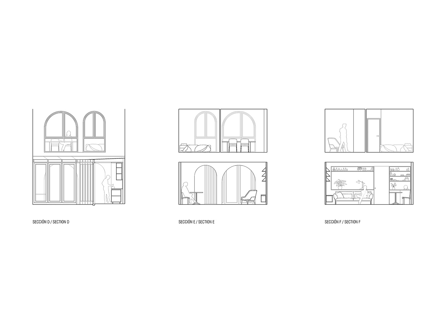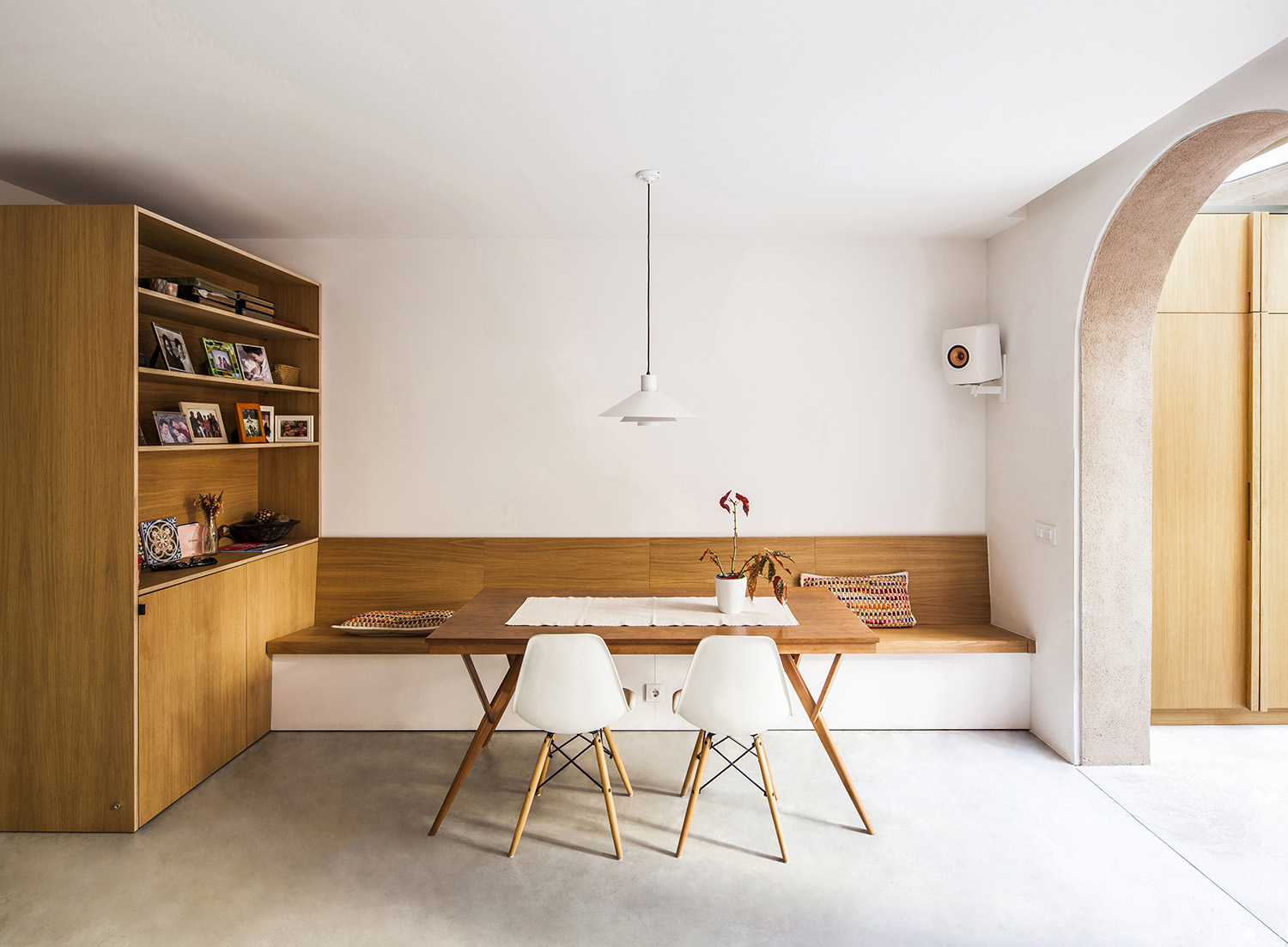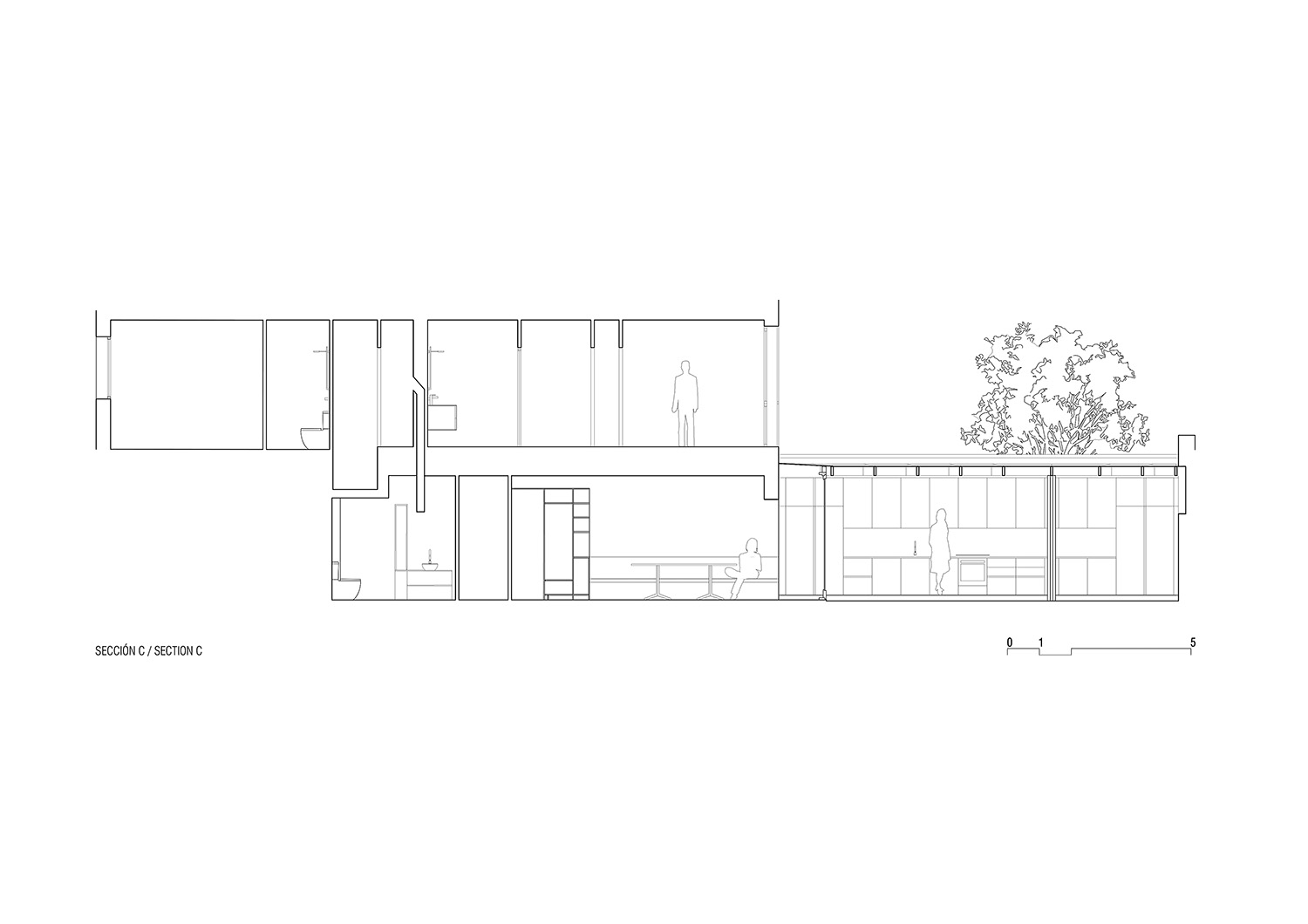La nueva fachada de la ampliación se separa de la vertical de la finca mostrando los dos arcos que originalmente encerraban el espacio interior y que ahora actúan como tránsito entre el salón–comedor y la nueva galería con la cocina y el estudio. Al separar la fachada de la vertical de la finca, la nueva envolvente se libera de las directrices del edificio existente, realizando unas pequeñas inflexiones que permiten más espacio en las zonas de mayor actividad, tanto en el interior como en el propio patio.