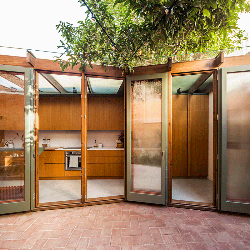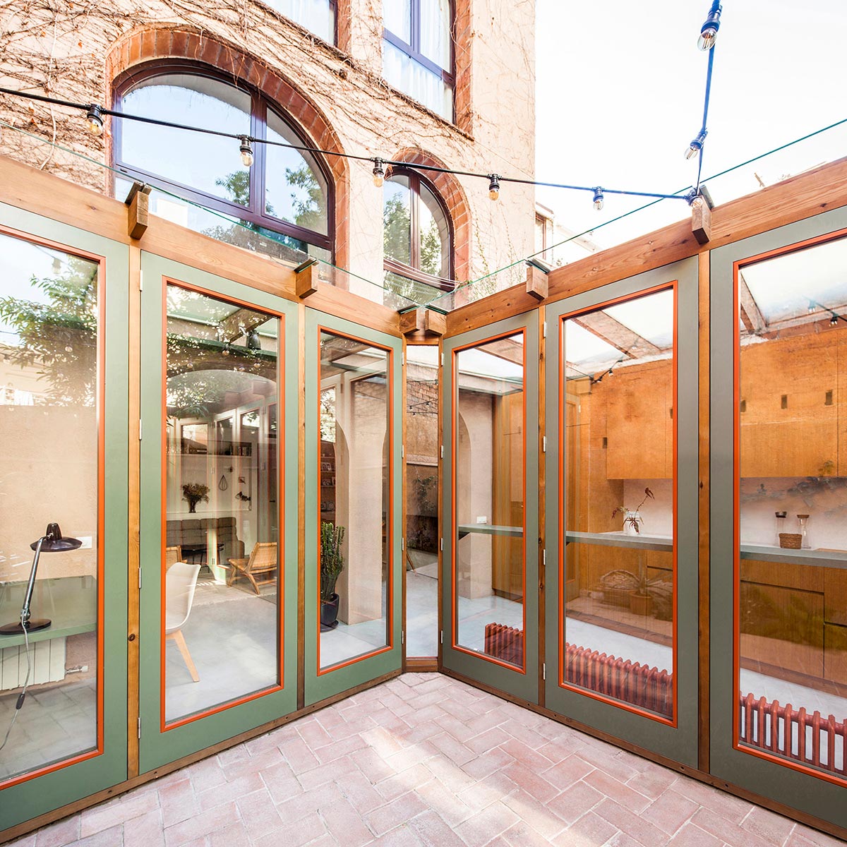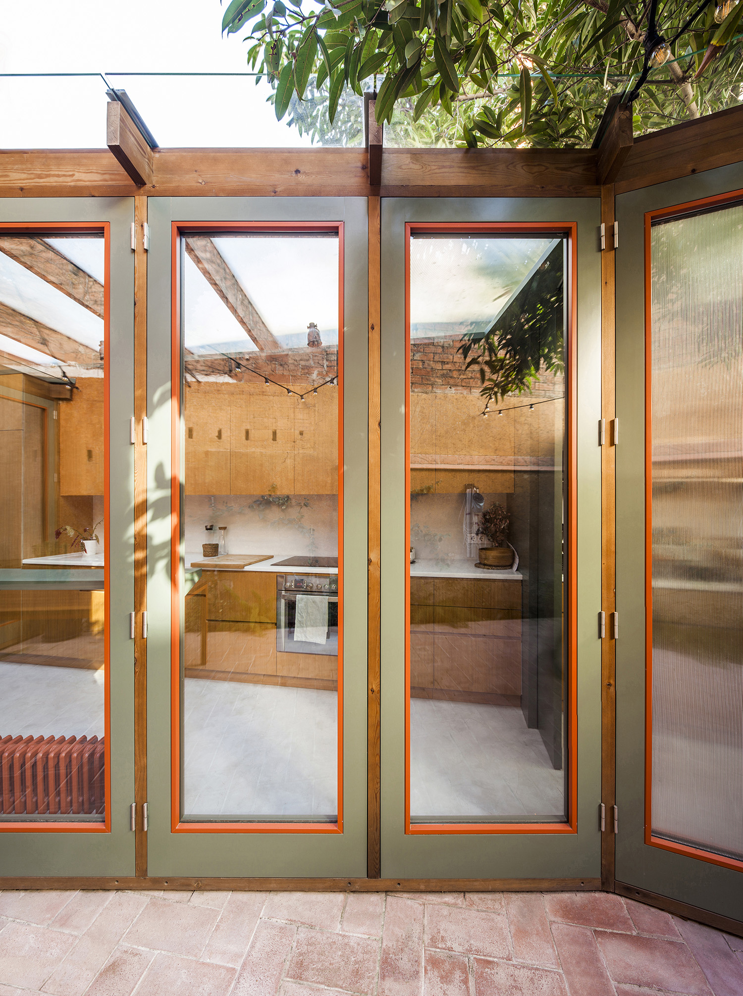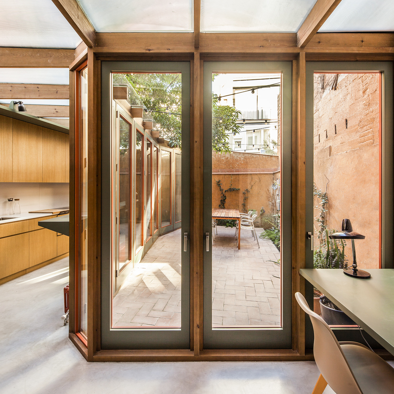 El nuevo volumen se realiza con una estructura de madera y vidrio, como un invernadero, en una ubicación donde, por las sombras del propio edificio y las de los vecinos, nunca hay una gran insolación. Por otra parte, al ser una pieza tan transparente, conseguimos que el resto de la planta baja continúe disfrutando de luz natural.