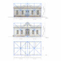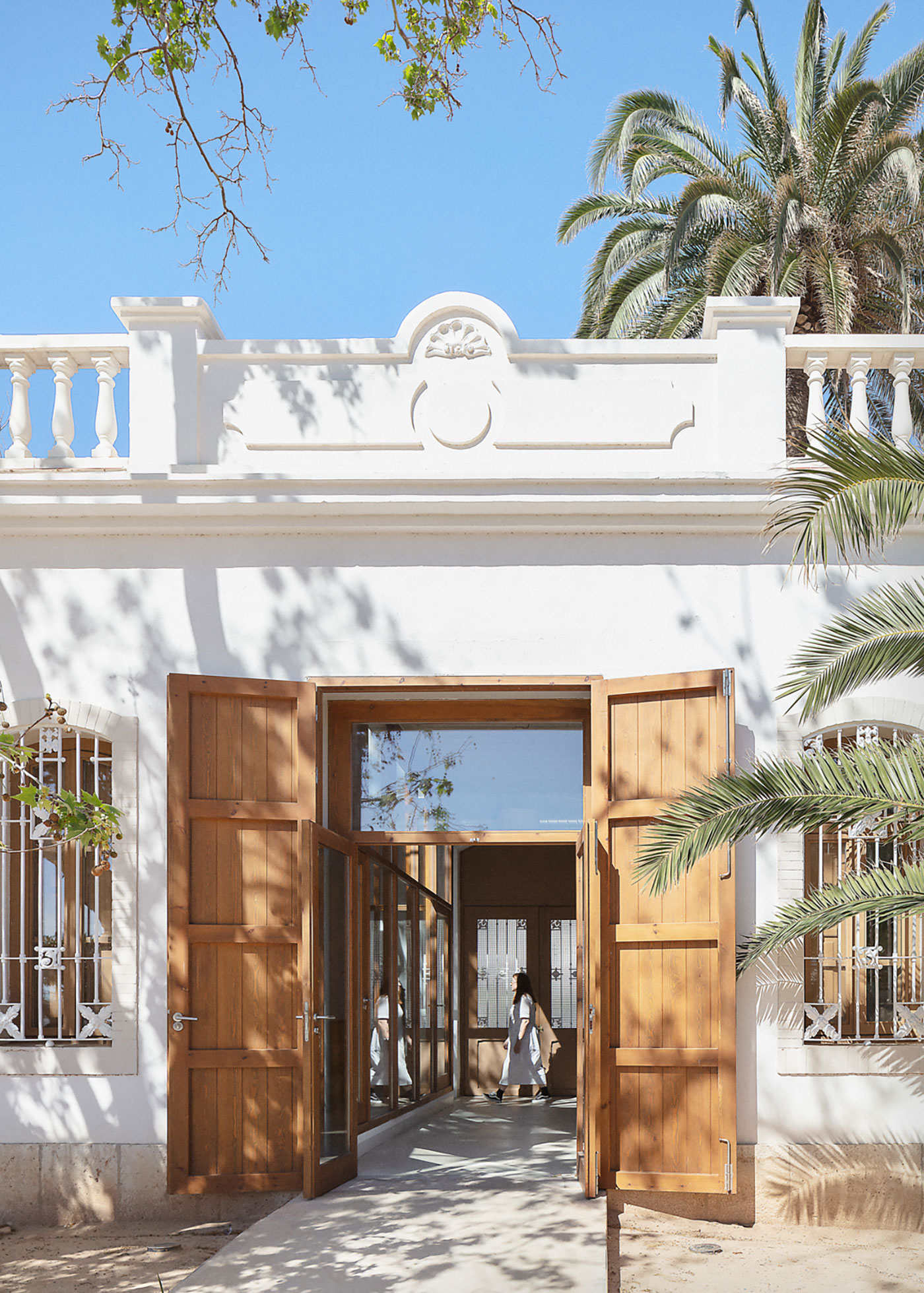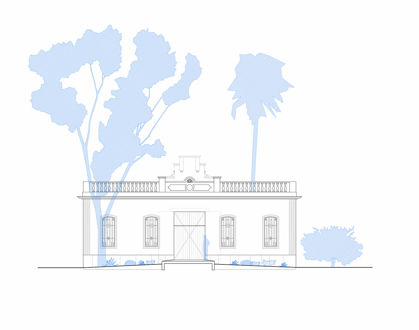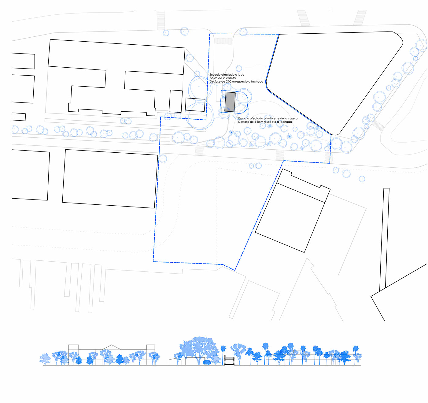 Siempre respetuosos con el valor patrimonial que la caseta posee, se protegen y restauran las fachadas, mientras en el interior se rehabilita por completo el espacio. La apertura de un patio y un muro cerámico distribuyen los usos y generan una atmósfera propia e íntima que permite el desarrollo de los trabajos, mientras una nueva puerta permite vincular el interior al nuevo espacio público.