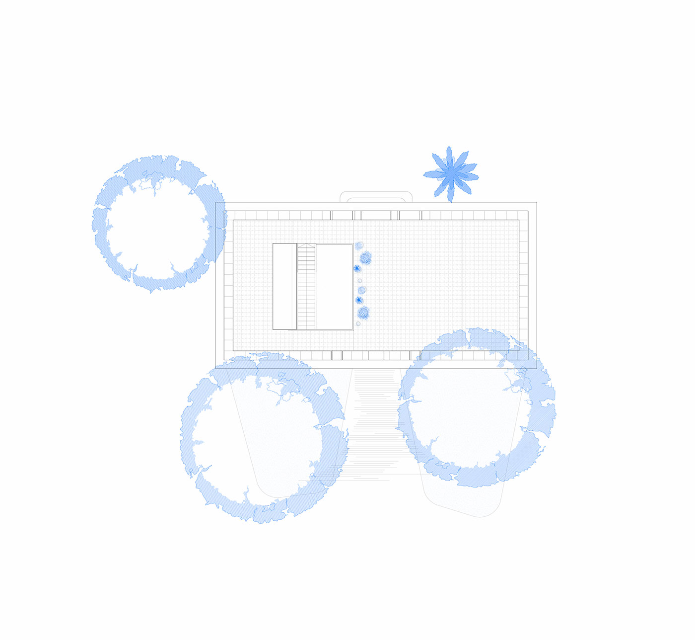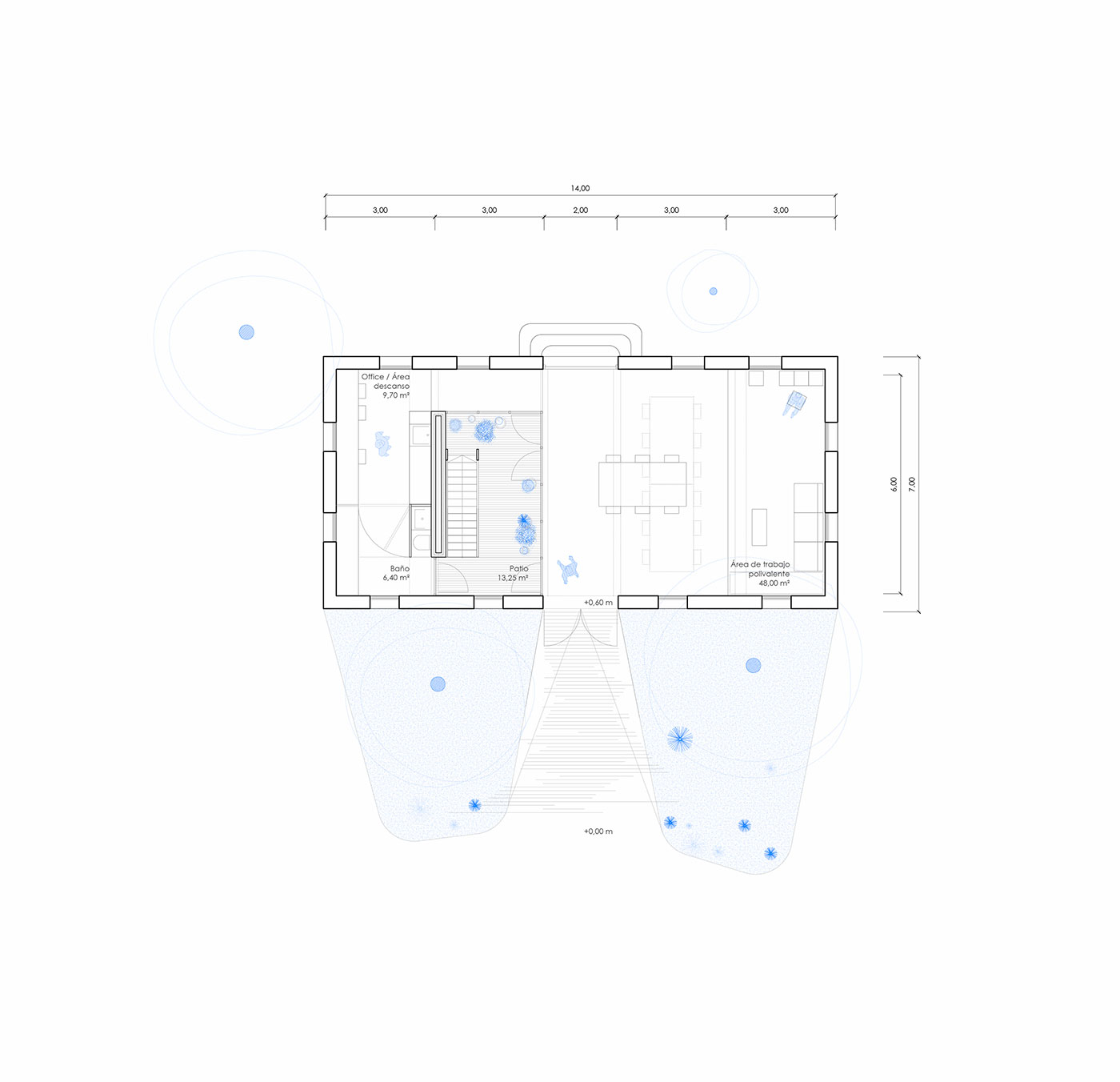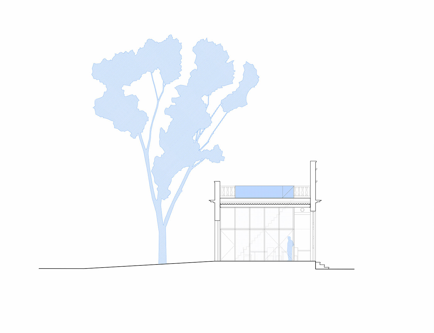 Se resuelve a su vez la necesidad de una mayor aportación de luz natural en el interior y de acceso a la cubierta para su mantenimiento, sin alterar la imagen volumétrica de la Caseta. De esta forma, se configura un espacio común de trabajo y un segundo espacio de carácter más privado que alberga los servicios mínimos de baño y oficina.