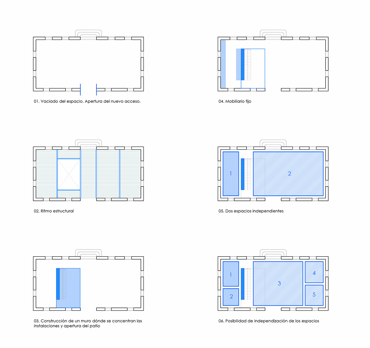 Presenta un espacio interior que se lee como una unidad y utiliza los cerramientos ligeros para diferenciar distintas áreas de actividad reubicando el acceso principal en la fachada este para abrirse a un espacio público de plaza de mayor dimensión.