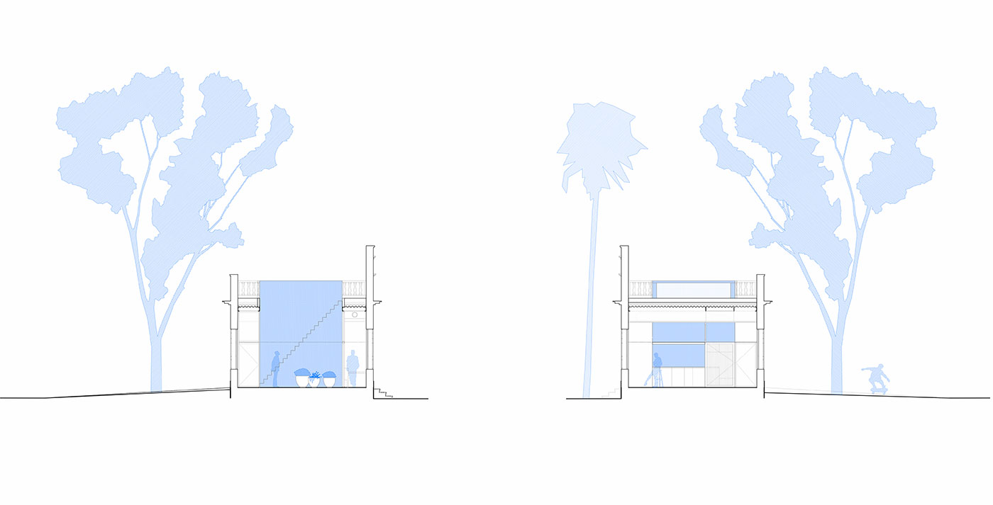 El edificio de la caseta se articula a través de un patio interior que genera las relaciones espaciales necesarias para dotar a los diferentes espacios interiores de la privacidad e independencia que requieren, posibilitando la separación y la matización de las diferentes actividades.