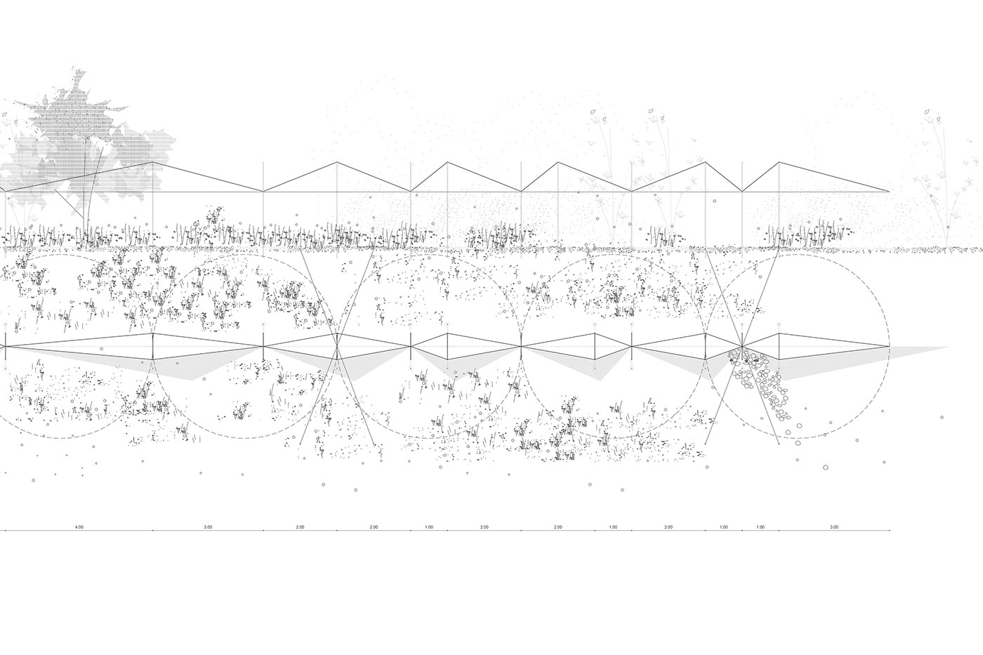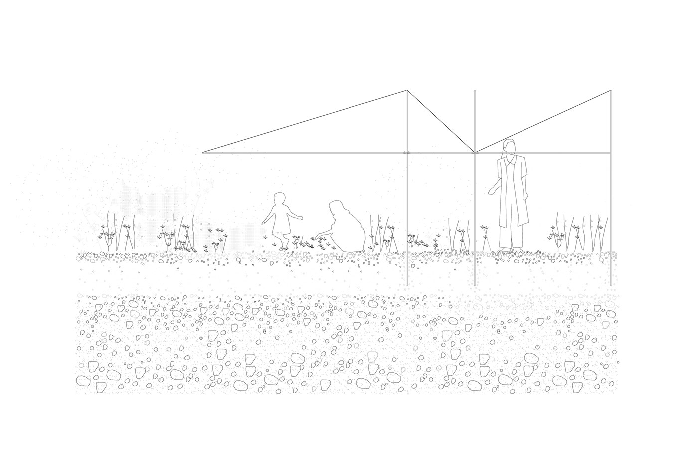 La cubierta textil, ligera y flotante, introduce un segundo plano de lectura: el de la sombra y la atmósfera. Las telas tensionadas entre los pórticos generan un juego de luces y penumbras que recuerdan los ritmos del cultivo, las protecciones estacionales y los cuidados cotidianos del campo. No es una cubierta funcional, sino simbólica: una evocación del trabajo, del cobijo y de los tiempos largos del paisaje agrícola.