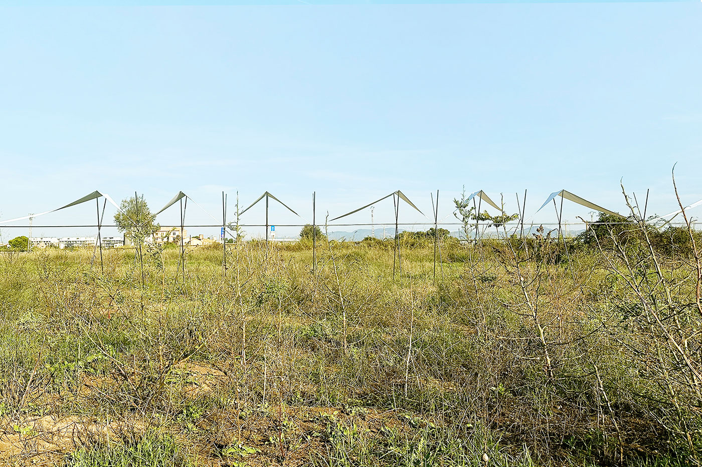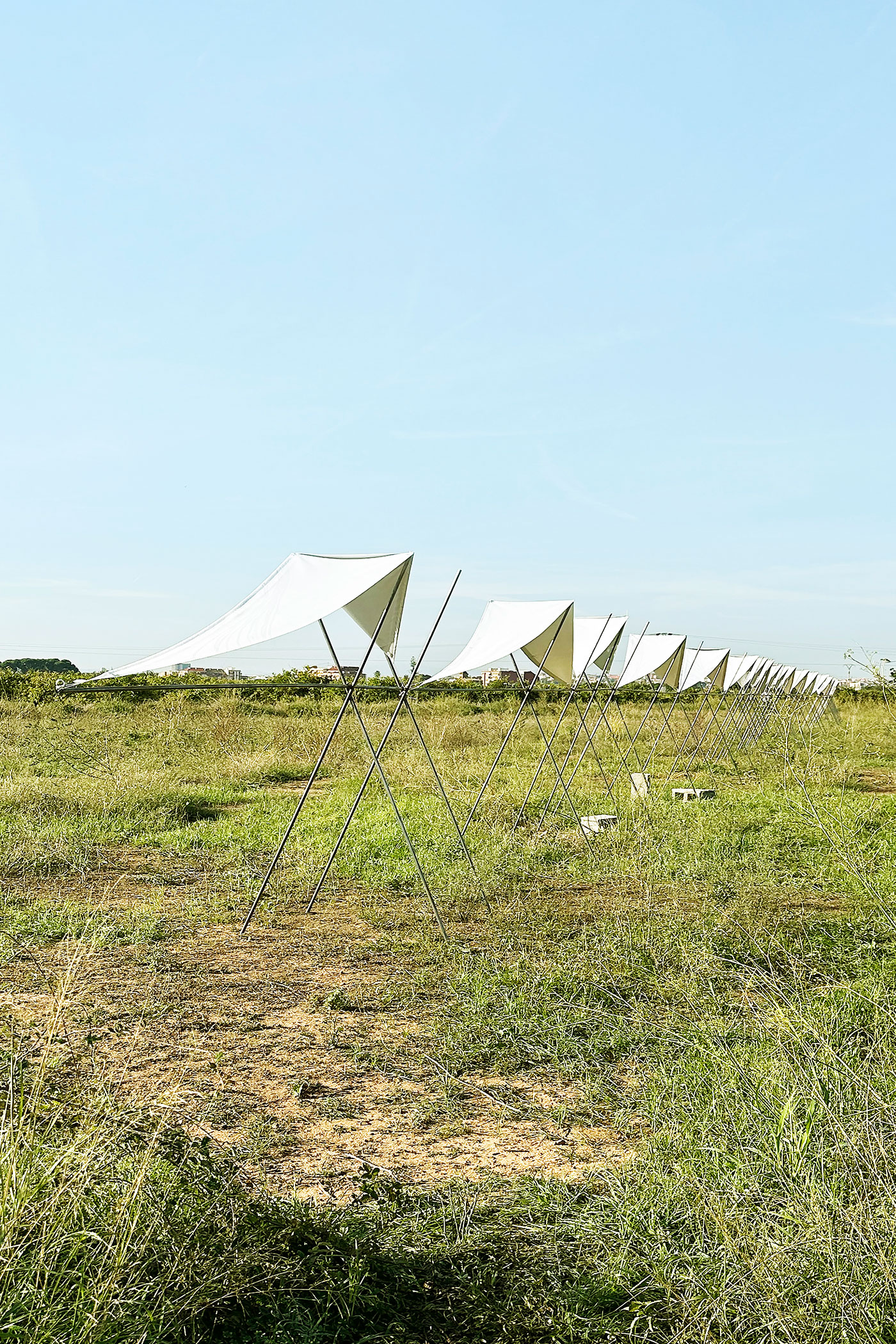 El pabellón 100 metros lineales se inserta en el paisaje de la huerta valenciana como una línea sutil y evocadora, construida a partir de la repetición rítmica de un pórtico reinterpretado. Esta estructura, inspirada en las tradicionales tomateras de madera que durante generaciones han sostenido el cultivo de tomates en la región, se adapta al presente mediante el uso de redondos de acero corrugado: un material contemporáneo, reciclable y reversible que mantiene la ligereza y la honestidad constructiva del original.