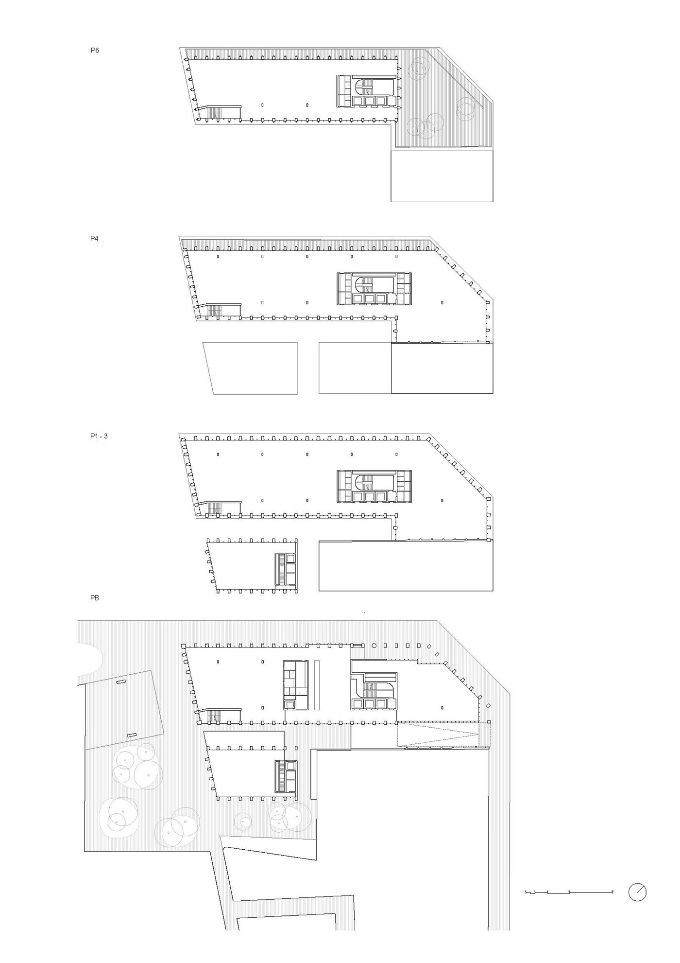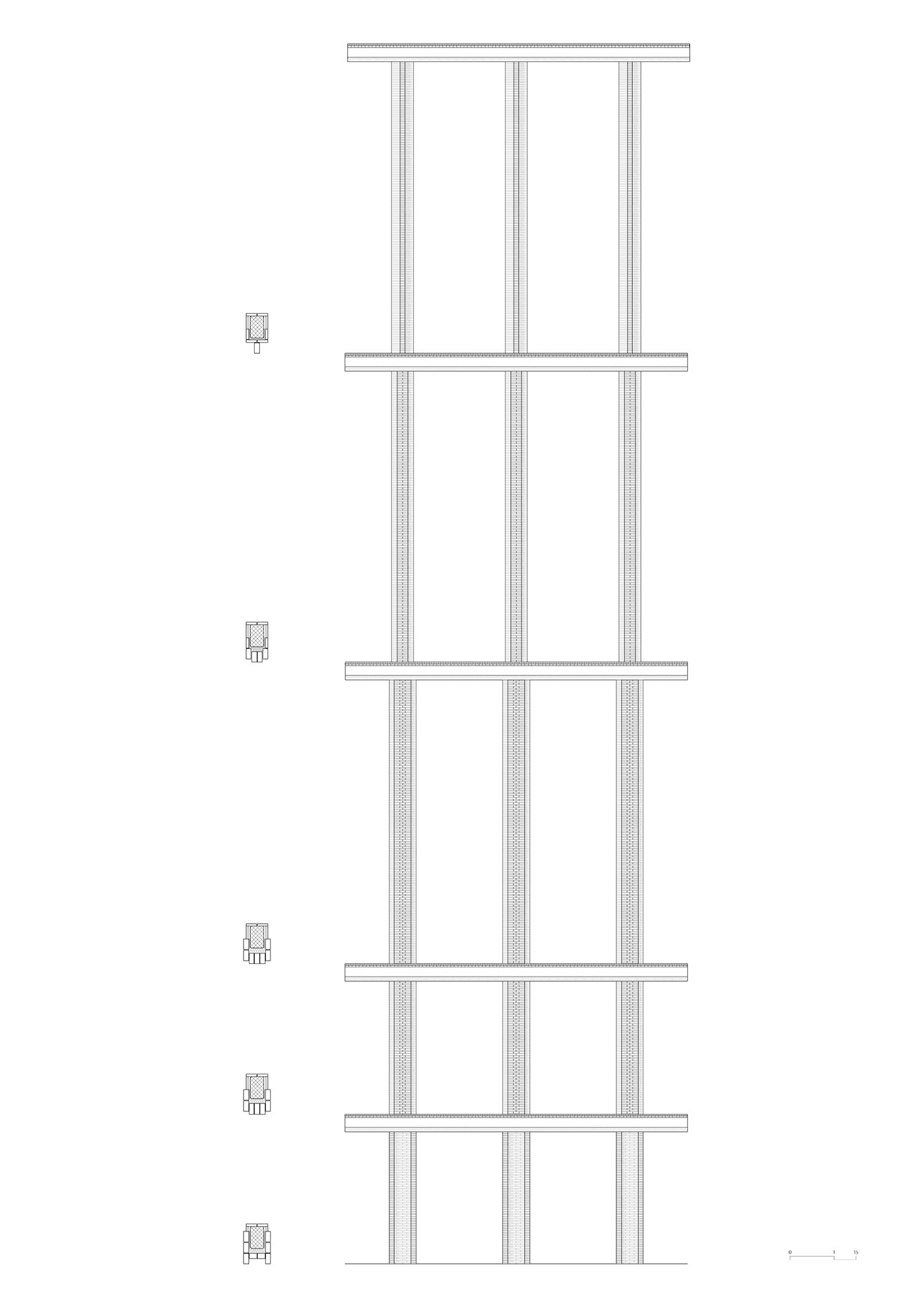 En altura, el volumen principal dibuja una sección escalonada, que pretende que el impacto de sus 8 plantas sea menor desde la calle y que el sol ilumine ese tramo con más facilidad. Esta sección permite unas terrazas de gran tamaño para disfrute de los usuarios, y construye el ritmo característico de la fachada. Asimismo, los diferentes niveles de altura de estas terrazas dialogan con las alturas del contexto, especialmente con la chimenea de la antigua fábrica que permanece en el lugar.