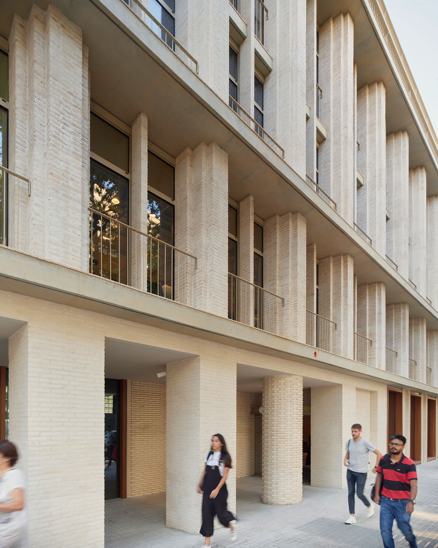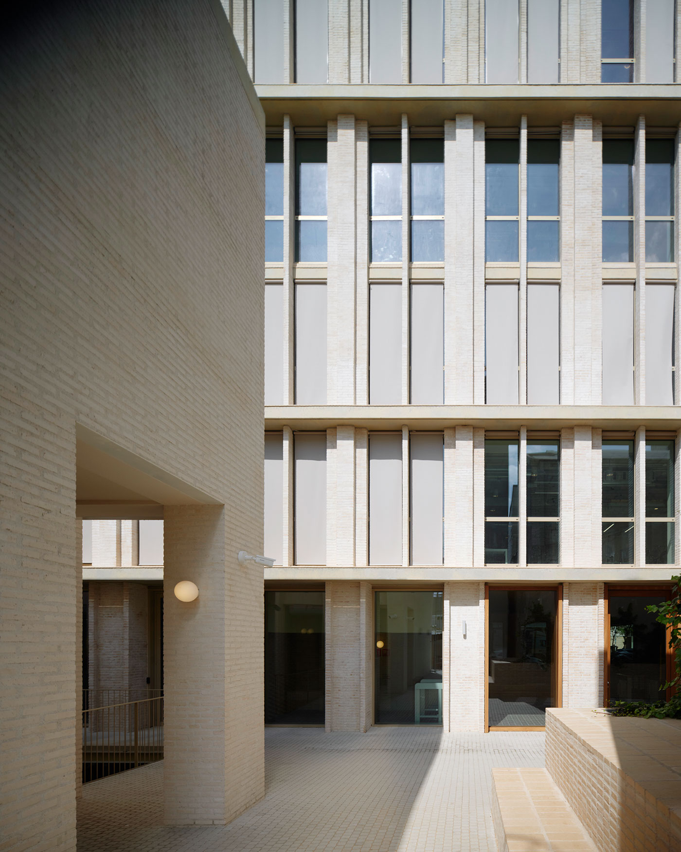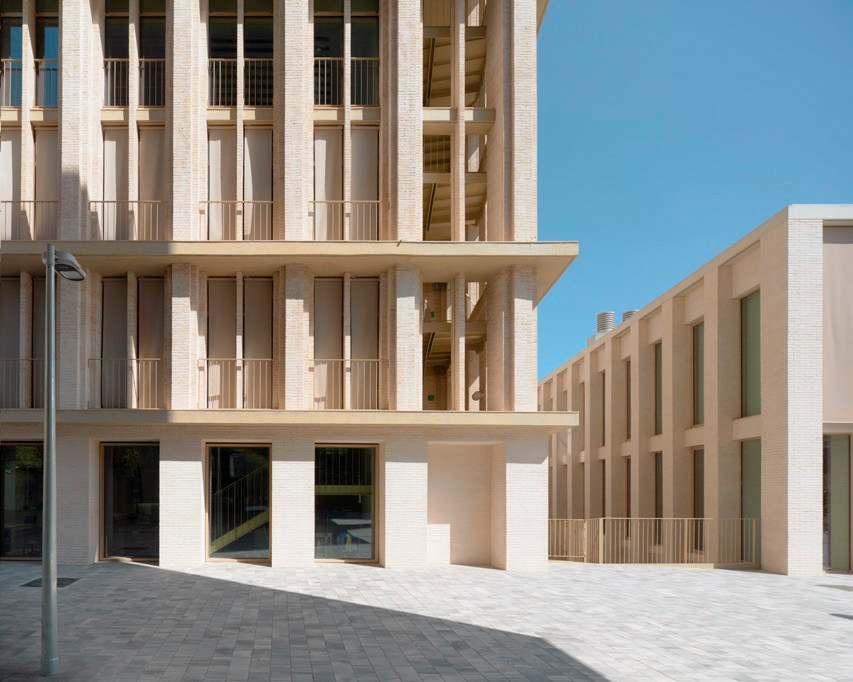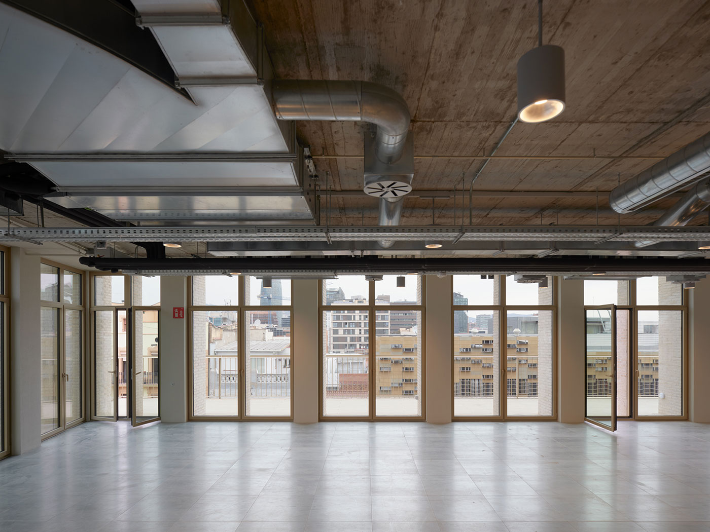 Por otro, el uso del material cerámico en la fachada, el ladrillo ecomanual, que remite a los antiguos edificios industriales del Poblenou, es un esfuerzo para ubicar el edificio en su contexto histórico. Con juntas de mortero de cal enrasadas con la cerámica, para enfatizar el monolitismo de un tipo de construcción manual, totalmente alejada del ensamblaje habitual de las fachadas ligeras. En definitiva, materiales, colores y texturas que conectan con el contexto industrial del barrio de un modo contemporáneo.