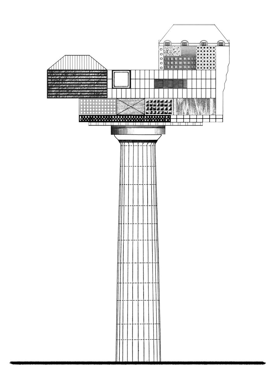 Y como las maldiciones sólo se enuncian para ser cumplidas y poder jactarse de ello ante la posteridad, Robert M. Stern presentó en 1980 un dibujo para la exposición “Late Entries”, donde revisitaba el Concurso para la torre del Chicago Tribune, tomando como referencia el proyecto de Loos, pero uniendo su concepto con un prisma miesiano y con un pretendido encuentro entre tradición y tecnología. El resultado no es columna ni pilar, sino mera pilastra.