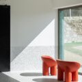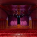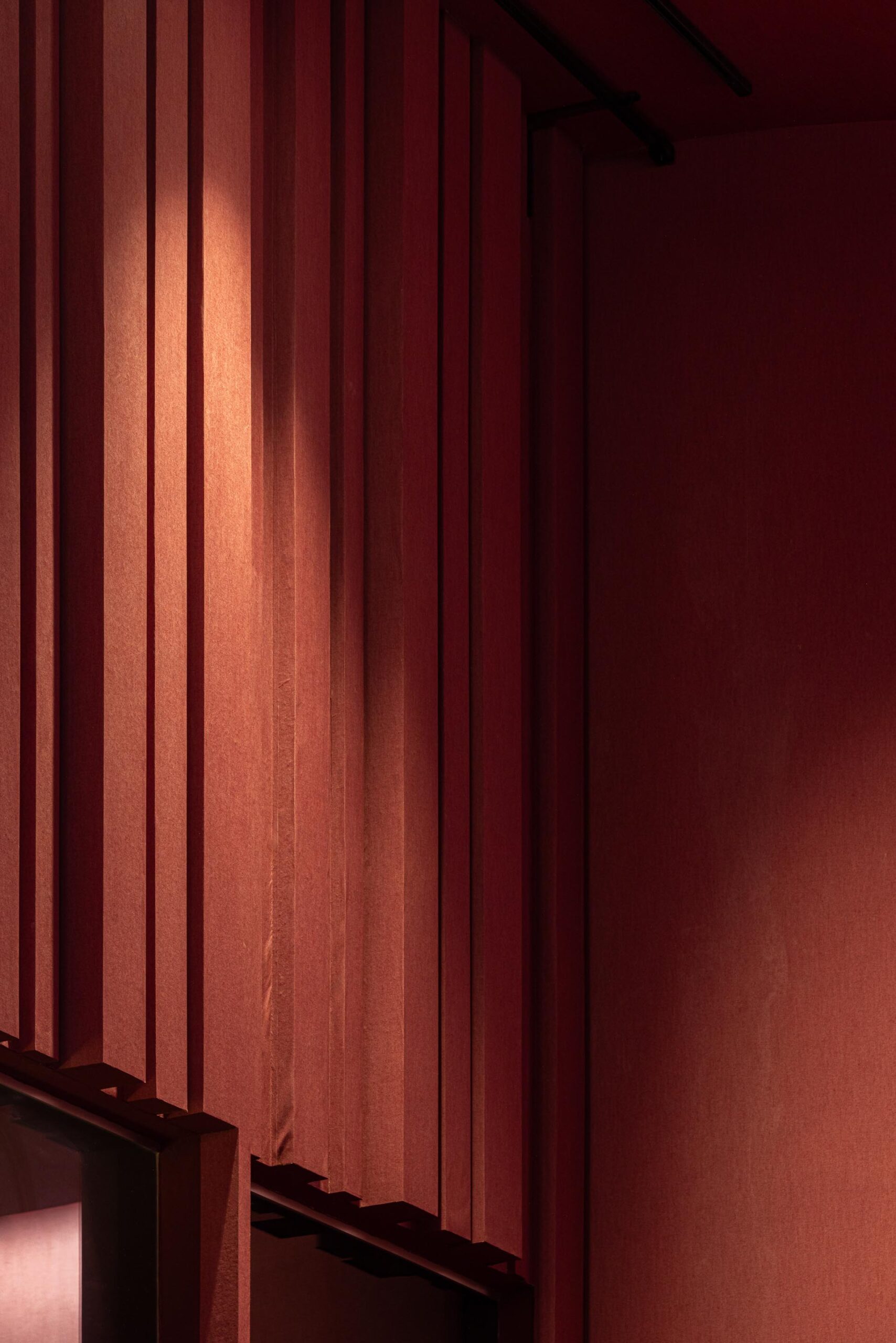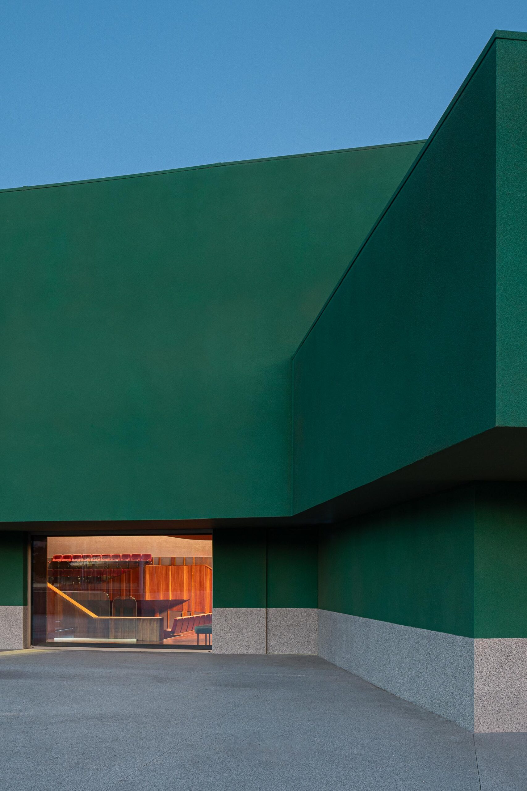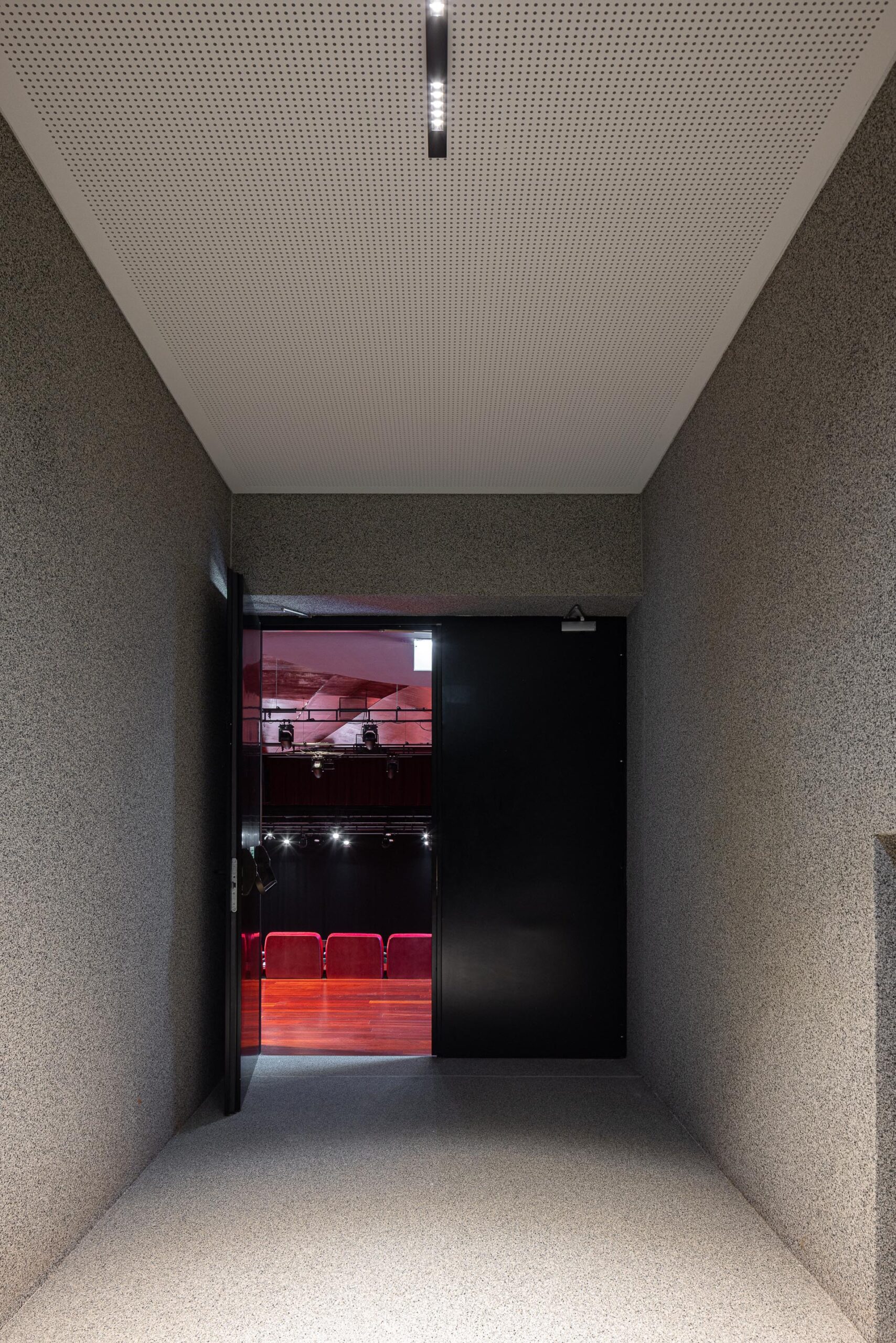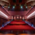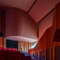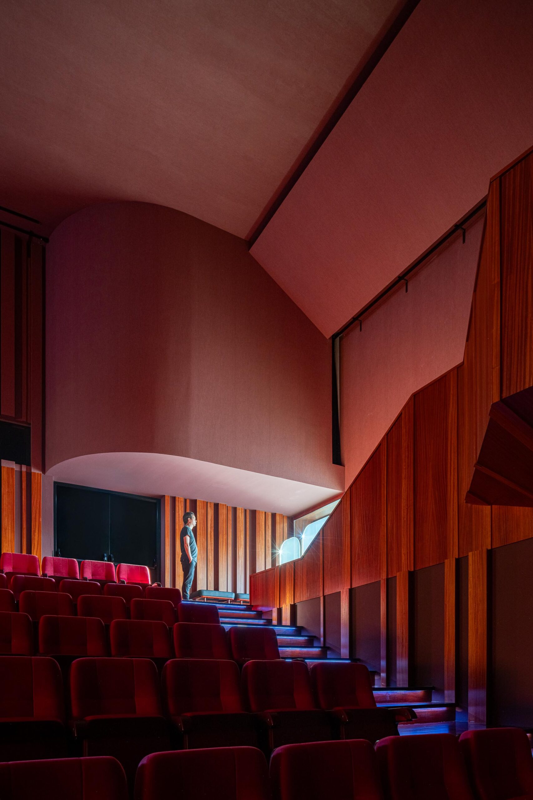 Si la plaza de acogida actúa como una alfombra que guía al visitante hacia el interior, el auditorio contrasta con el exterior: revestido con una formalidad marcada, los tonos rojo profundo aportan calidez al espacio que espera a su público.