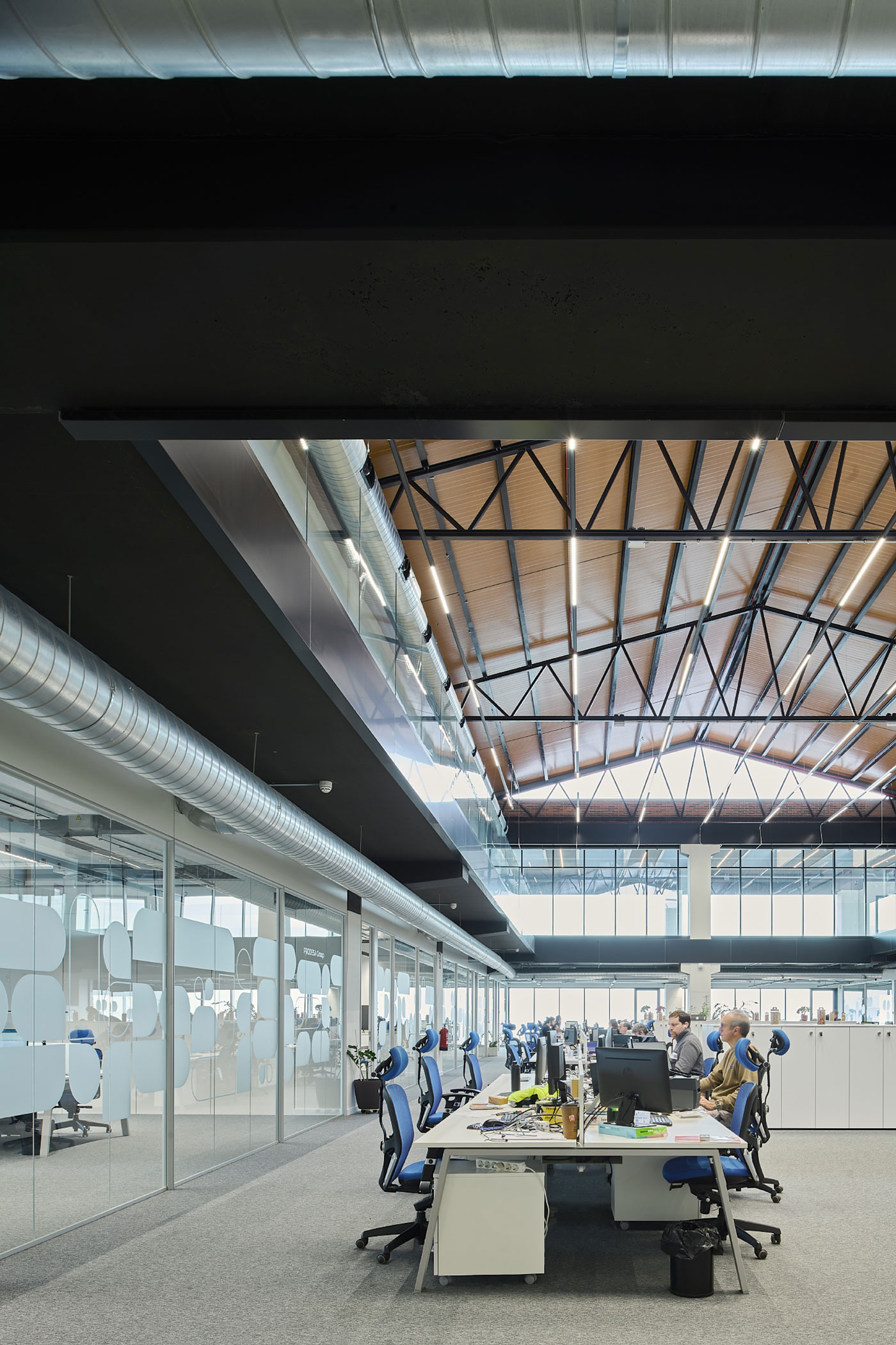 El núcleo central del edificio alberga la oficina técnica de ingeniería, un espacio amplio y luminoso con doble altura diseñado para facilitar el trabajo colaborativo. Alrededor de este corazón estratégico se distribuyen los departamentos de recursos humanos, administración y gerencia, garantizando una comunicación fluida y una visión integral del negocio.