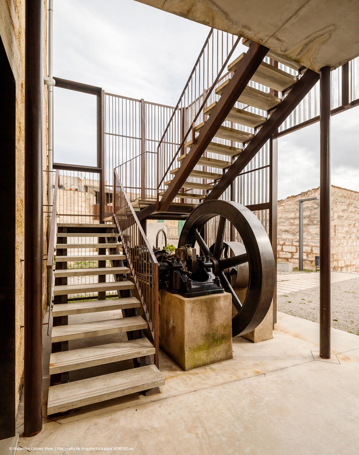 Se elimina la construcción en estado de ruinas que conectaba el molino con la Farinera y se genera un nuevo acceso urbano desde la calle Creu. Por otro lado, se construye una escalera nueva de acceso a esta plaza desde la calle Recto Tomás. Estos nuevos accesos consiguen un nuevo flujo de tránsito peatonal entre estas calles. Esta plaza semipública, es un espacio exterior que funciona como nexo de unión entre el molino y la Farinera. Se entiende como las circulaciones entre las salas polivalentes y expositivas que albergan ambas construcciones.