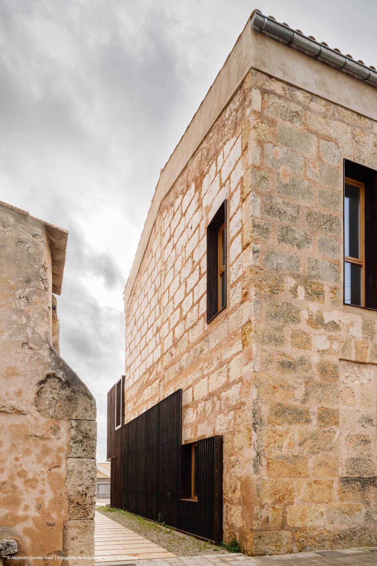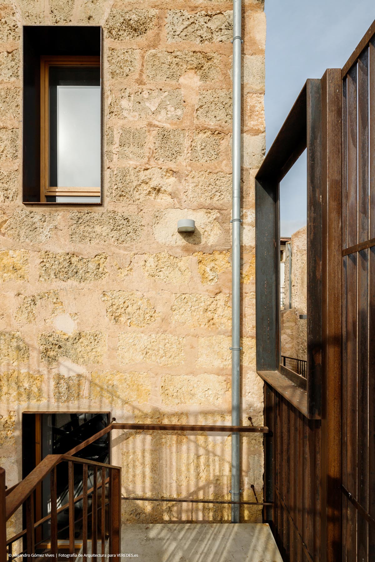 La piedra de marés existente de la fachada se mostrará como calidad protagonista. Las carpinterías son de madera. El acero también se muestra en los recercos de acero de los accesos y ventanas que ahora redefinen una nueva fachada respecto la medianera ahora expuesta, habiendo reutilizado los huecos anteriores tapiados.