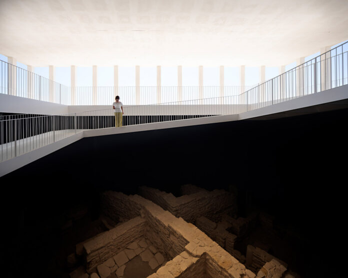 El terreno en el que se desarrolla el proyecto se ubica en el borde urbano del municipio, en una ladera de lo que fue el epicentro de la antigua ciudad romana. Allí, el nuevo edificio se abre hacia la pendiente, conformando un espacio que, al mismo tiempo, ofrece una lectura clara con respecto al contexto en el que se inserta y sirve de referencia icónica del propio monumento de la cisterna, registrado en el nivel inferior.
