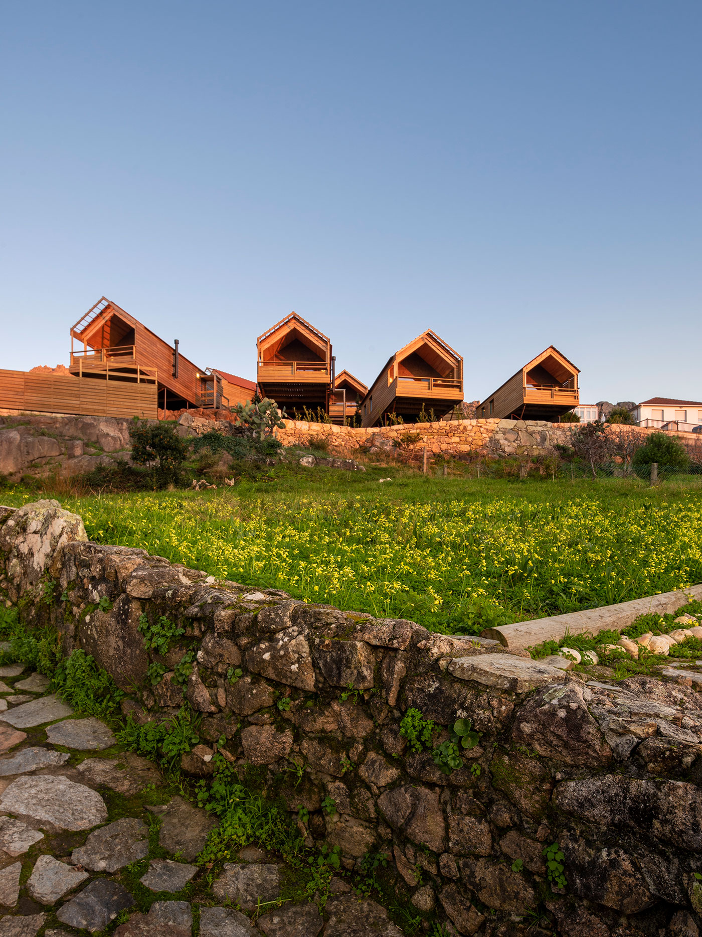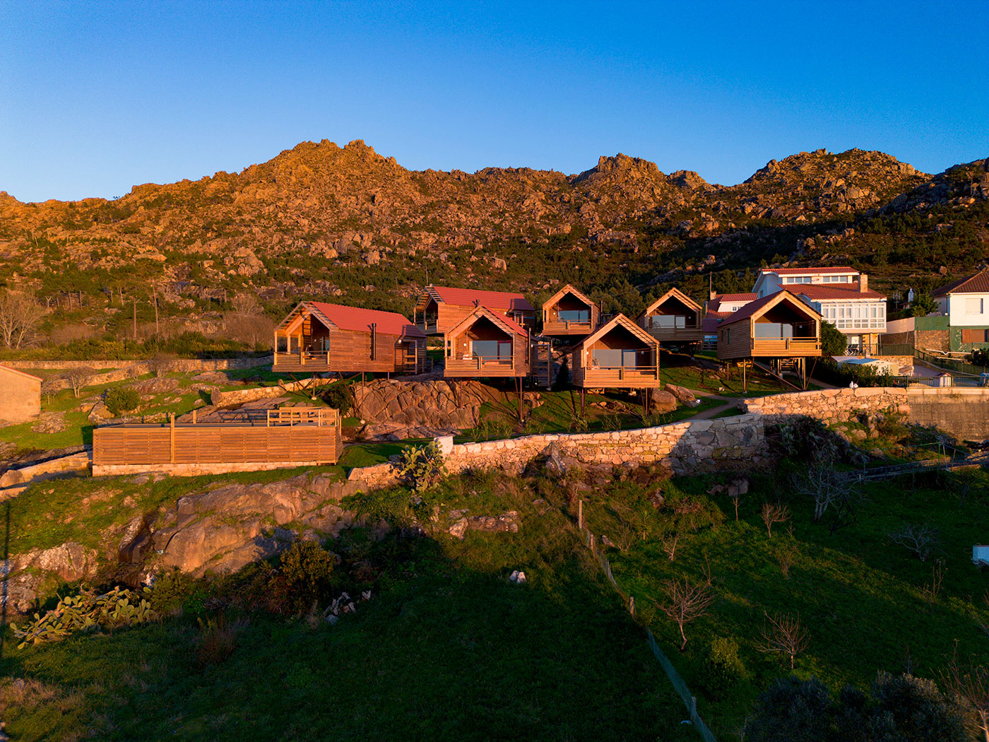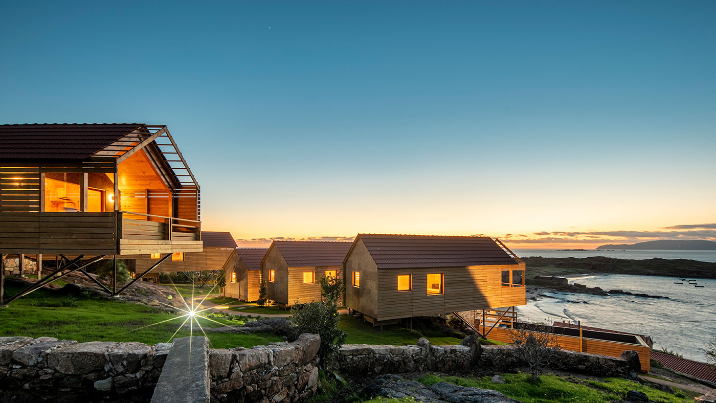 Conjunto de 7 cabañas o ‘refuxos’ situados en el puerto natural de Quilmas (Carnota, A Coruña), obra de Salgado e Liñares Arquitectos y fraguado como un eco de las primeras casetas tradicionales de pescadores, viejos refugios de cubierta a dos aguas, que ahora se elevan para mirar al horizonte.