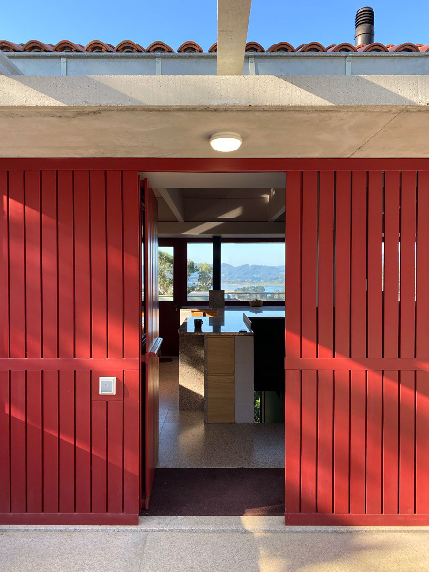 Destaca la relación entre la cubierta a dos aguas y la estancia que techa: a través de la geometría de las vigas pared que soportan el encofrado de la cubierta, se pauta y equilibra su direccionalidad aprovechando un pequeño altillo para almacenaje.