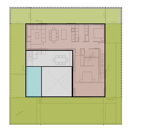 La vivienda se proyecta a partir de una geometría contundente: un solar cuadrado perfecto de 21m x 21m. La proporción áurea está detrás de todas las medidas que escalan esta casa de 110 m2. Se trata de un proyecto pensado a escala humana, que responde al deseo de vivirlo con sencillez sin las complicaciones de mantenimiento de una casa grande.